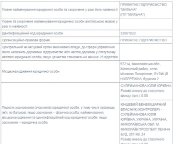 Частное предприятие «Мильча» зарегистрировано в 2002 году в Жовтневой районной государственной администрацией Николаевской области. Местонахождение предприятия – село Мешково-Погорелово, улица Набережная, 2. Директором предприятия является Юлия Юрьевна Сулейманова.