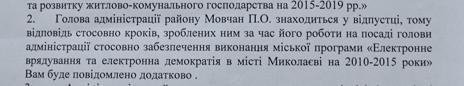 «Глава администрации Мовчан П.О. находится в отпуске, поэтому ответ относительно обеспечения выполнения городской программы «Электронное управление и электронная демократия в гороже Николаеве на 2010-2015 годы» Вам будет сообщен дополнительно».