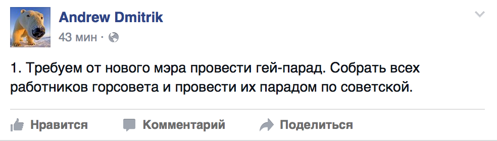 Прочитал метафоричное высказывание о том, что Александру Сенкевичу следовало бы устроить «гей-парад» на Советской с объяснением, что речь идет об уволенных сотрудников нынешней мэрии.