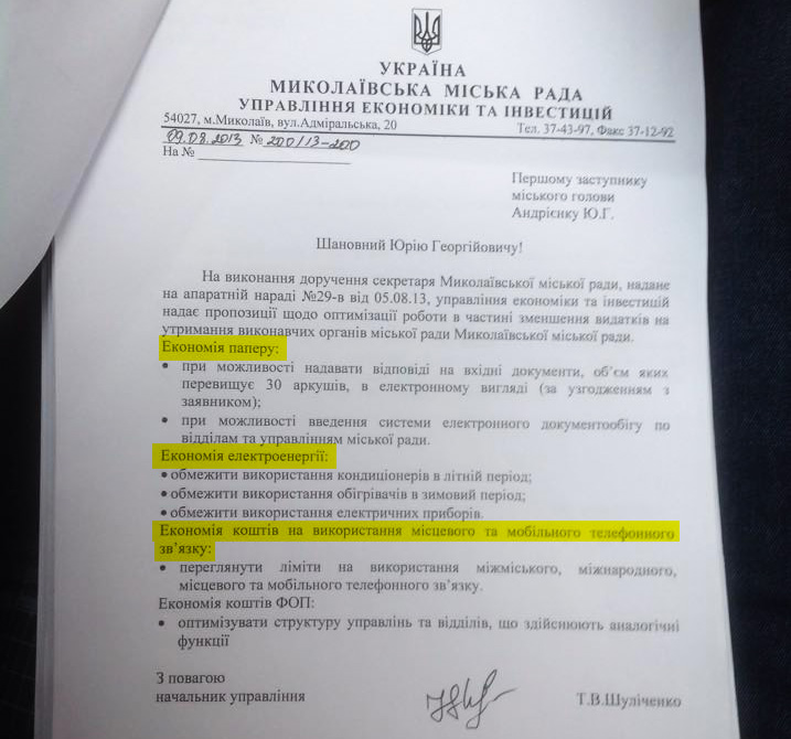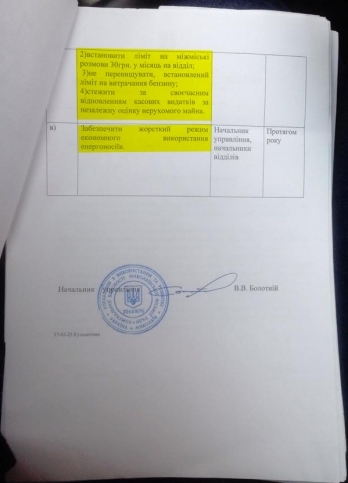 Начальник управления по использованию и развитию коммунального имущества Виталий Болотний предложил сократить на 10% предоплату на печатную периодику, установить лимит в 30 гривен на междугородние переговоры по телефону, а также следить за тем, чтобы подчиненные не превышали лимит на использование бензина.