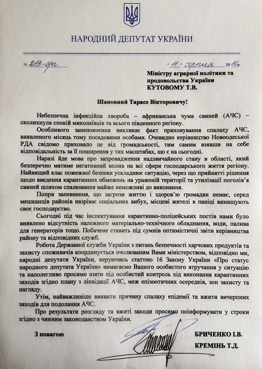 Такий лейтмотив позапланової екстреної зустрічі з першим заступником Міністра аграрної політики та продовольства України Максимом Мартинюком, головою Державної служби України з питань безпечності харчових продуктів та захисту споживачів Володимиром Лапою голови Миколаївської обласної ради Вікторії Москаленко, мого колеги-нардепа з аграрного комітету Ігоря Бриченка, що відбулася вчора, 11 серпня.