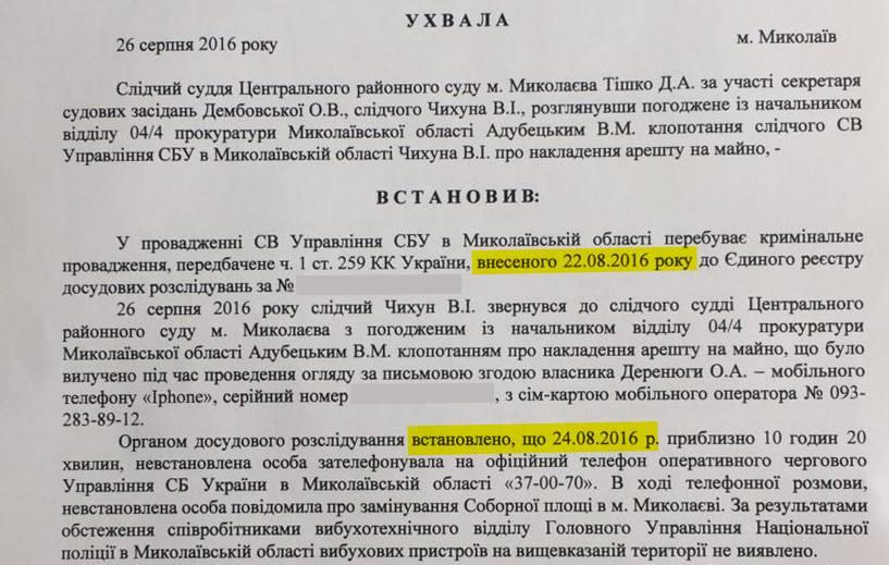 Снова пригласили в «управу», где вручили постановление суда об аресте телефона. Веселая ситуация. Оказывается, УСБУ в Николаевской области еще 22 августа (!) открыла уголовное производство, согласно которому, 24 августа с моего телефона будет совершено ложное сообщение о минировании Соборной площади.