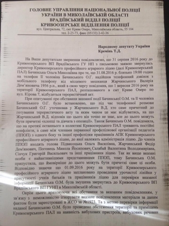 Щодо можливого замінування Кривоозерського аграрного ліцею