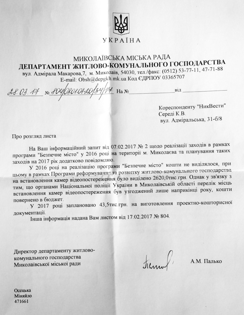 Проектом бюджета Николаева на 2016 год было предусмотрено выделение 3 миллионов гривен на покупку и установку камер видеонаблюдения. Однако за год в мэрии так и не смогли подготовить и согласовать с полицией проект установки новых видеокамер, из-за чего деньги не были потрачены.