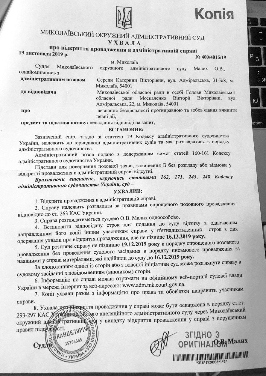 Николаевский окружной административный суд открыл производство в отношении главы Николаевского областного совета Виктории Москаленко, которая проигнорировала информационный запрос НикВести. Дело будет рассмотрено судьей Оксаной Малых до 19 декабря.