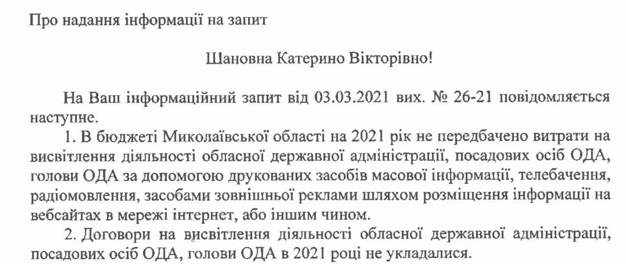 У Миколаївській облдержадміністрації повідомили, що бюджетом не передбачено кошти на висвітлення діяльності ОДА, посадових осіб ОДА, голови ОДА за допомогою будь-яких ЗМІ, або засобами зовнішньої реклами тощо.