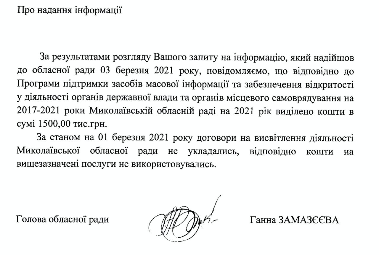 У відповідь на інформаційний запит у Миколаївській обласній раді повідомили, що відповідно до Програми підтримки засобів масової інформації та забезпечення відкритості діяльності органів державної влади та органів місцевого самоврядування на 2017 - 2021 роки Миколаївській обласній раді на 2021 рік виділено кошти у сумі 1,5 мільйона гривень.