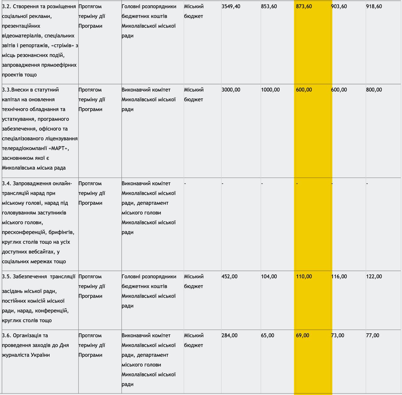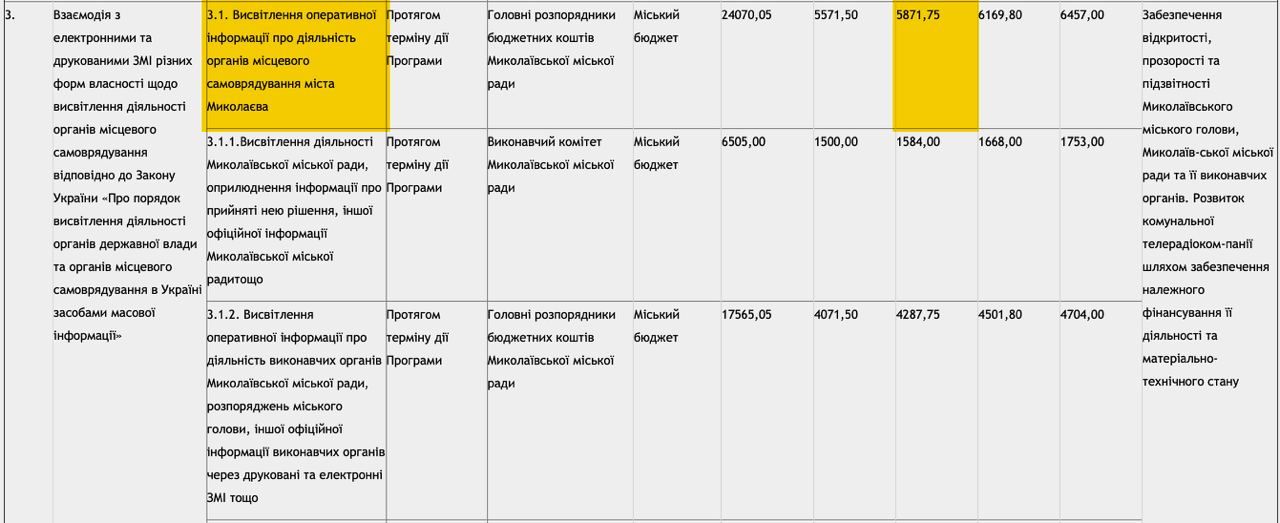 Поряд з тим, відповідно до Програми розвитку інформаційно-комунікативної сфери міста Миколаєва на 2021 рік у розділі «Взаємодія з електронними та друкованими ЗМІ різних форм власності щодо висвітлення діяльності органів місцевого самоврядування відповідно до Закону України «Про порядок висвітлення діяльності органів державної влади та органів місцевого самоврядування в Україні засобами масової інформації» передбачено фінансування у розмірі 7 мільйонів 524 тисячі 350 гривень, із них: