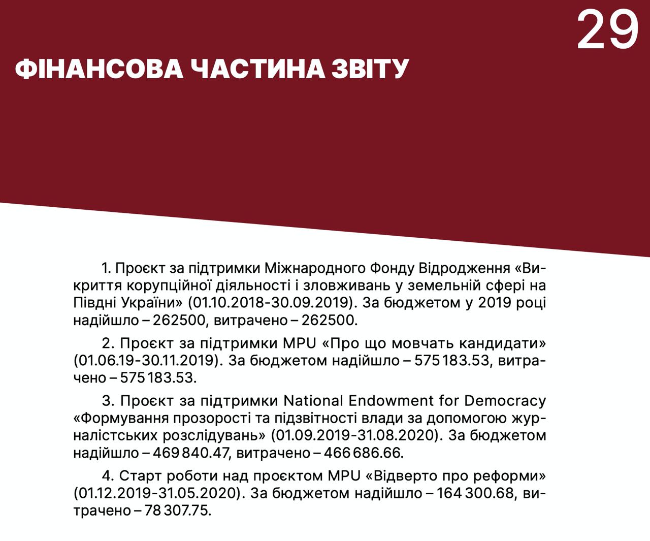 Але, варто зазначити, що у минулих роках такі звіти публікувало видання “Центр журналістських розслідувань”. Сайт у своїх річних звітах про діяльність розповідав про міжнародні проекти, що фінансували діяльність видання.