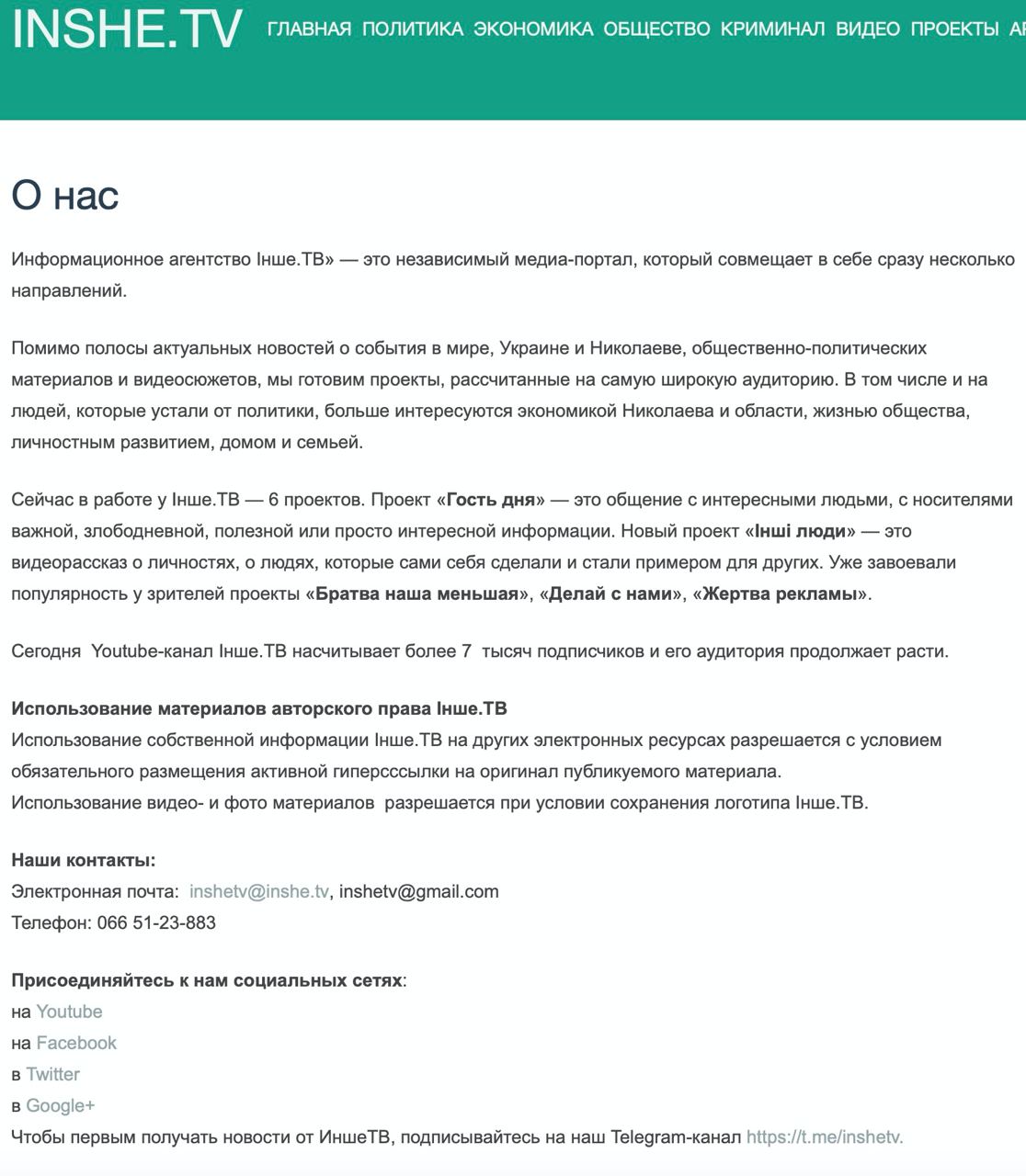 Видання “Інше ТВ”, яке стало аутсайдером серед онлайн-ЗМІ Миколаєва щодо відкритості, на своєму сайті надає читачам лише електронну пошту та контактний телефон.