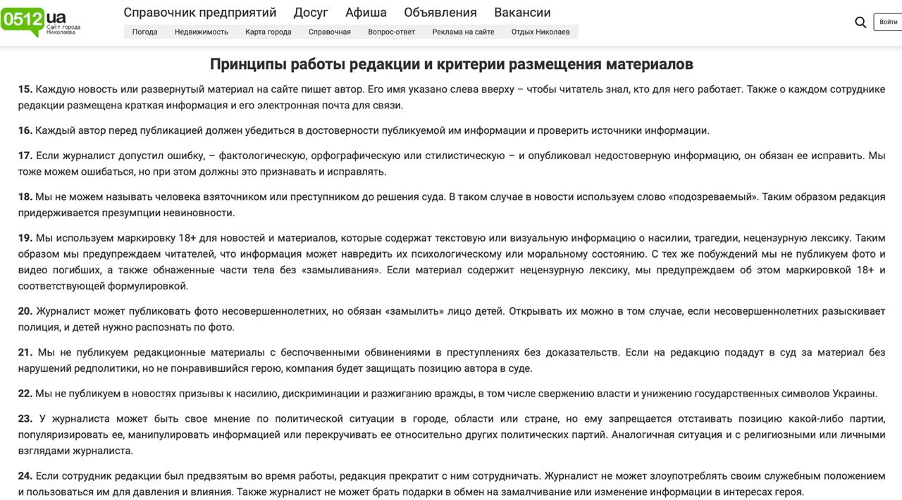 Редакційну політику та інформацію про принципи, за якими працює видання, публікують лише три онлайн-ЗМІ: “0512”, Центр журналістських розслідувань” та “Свідок.Інфо”.
