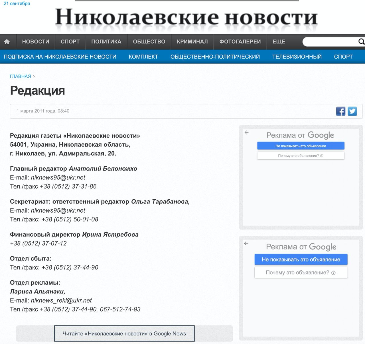 Лише два видання (“Центр журналістських розслідувань” та “Николаевские новости”) у розділі “Контакти” надали читачам повну інформацію про контактний телефон, адресу та e-mail, за якими можна звернутися до редакції. Інші ж видання приховують своє місцезнаходження. Видання “Шиповник” надало лише електронну пошту редакції.
