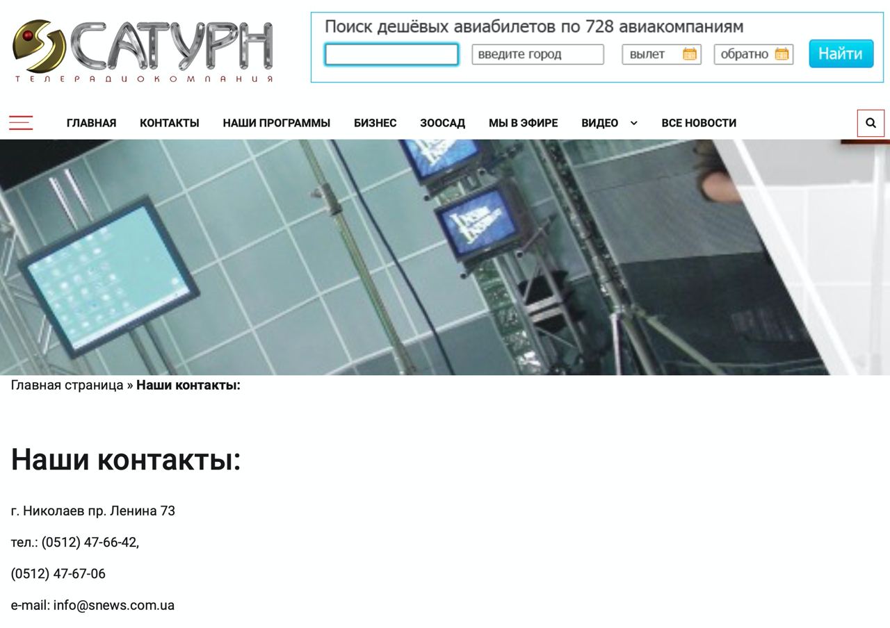 Ще одним миколаївським телеканалом, який показав абсолютну непрозорість, став телеканал “Сатурн” - за результатами моніторингу він отримав 1 бал. На сайті телеканалу у розділі “Контакти” вказані телефон, електронна пошта та адреса. Інші дані про редакцію на сайті телеканалу відсутні.