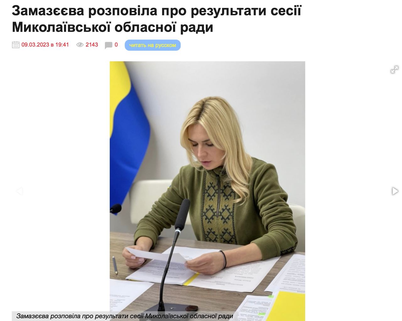 Ще у п’яти публікаціях видання посилалися на голову Миколаївської облради Ганну Замазєєву, яка звітувала про результати сесії облради та допомогу дітям військовополонених. Всі ці новини об’єднує те, що прізвище чиновниці фігурувало в заголовку та новина ілюструвалася її фотографією.