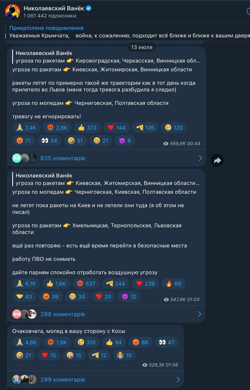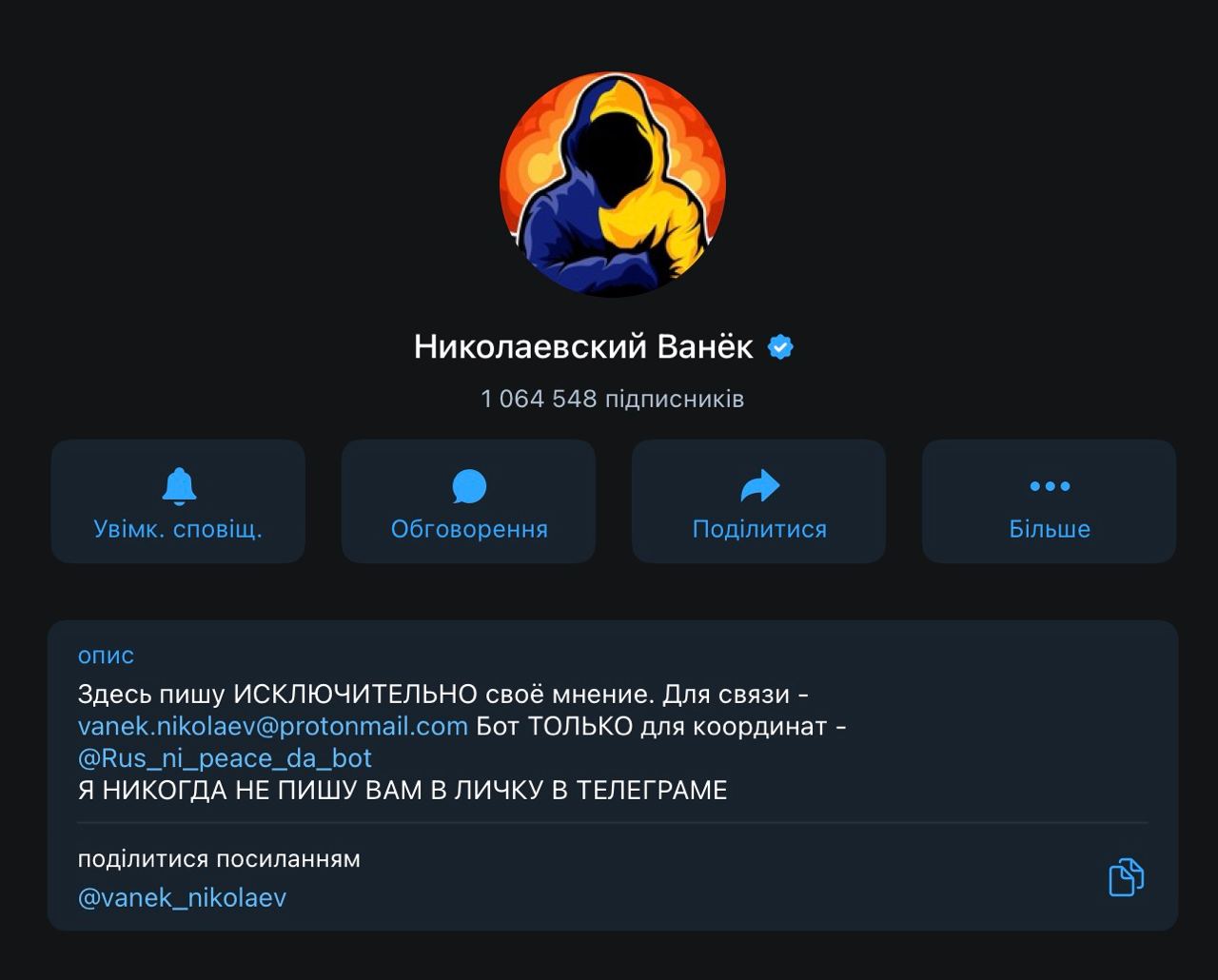 «Николаевский Ванёк» — 1 мільйон 64 тисячі 548 підписників. Хоч канал і верифіковано, про що свідчить спеціальна позначка біля його назви, фактично достеменно невідомо, кому він належить.