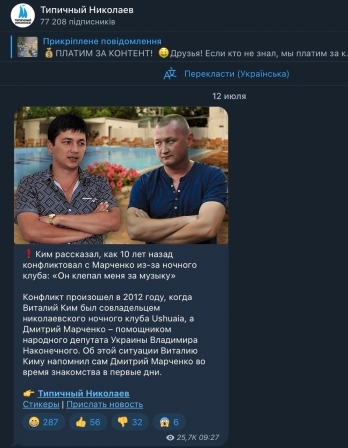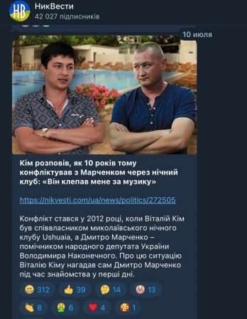 А 12 липня телеграм-канал скопіював публікацію видання «НикВести» від 10 липня, яка стосувалася коментаря голови ОВА Віталія Кіма щодо історії стосунків з генералом Дмитром Марченком, видаливши при цьому посилання на новину медіа.
