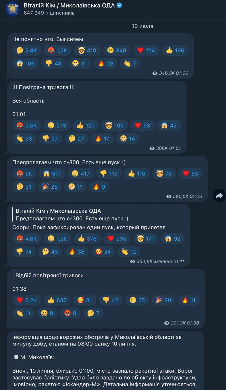 Телеграм-канал «Віталій Кім / Миколаївська ОДА» налічує 647 349 підписників на момент аналізу, проте статистика каналу свідчить про те, що їх кількість зменшується. Канал було створено у перший день повномасштабної війни — 24 лютого 2022 року. Саме цей телеграм-канал став основним джерелом інформації для жителів Миколаївської області про ситуацію в регіоні в перші місяці повномасштабної війни. Проте, якщо раніше Віталій Кім регулярно особисто з’являвся у постах, публікуючи вочевидь зняті особисто відео, де він коротко розказував про поточну ситуацію, то в останні місяці там публікується переважно офіційна інформація від Миколаївської ОВА, а також повідомлення про повітряну тривогу та наслідки обстрілів в регіоні. Можливо, це пов‘язано з тим, що після деокупації Херсону та Снігурівки кількість обстрілів Миколаєва значно зменшилася, а нові інфоприводи у голови Миколаївської ОВА не з‘явилися.