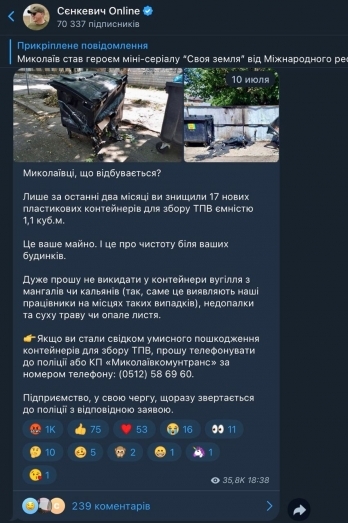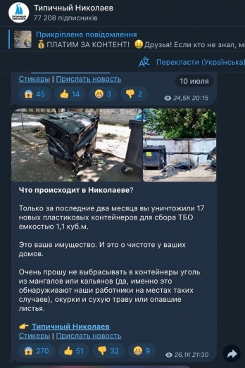 Наприклад, 10 липня «Типичный Николаев» просто скопіювали (переклавши на російську мову) публікацію з каналу мера Миколаєва Олександра Сєнкевича про знищені сміттєві баки.