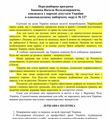 Начальник Администрации Николаевского морского порта Василий Иванюк зарегистрирован кандидатом на 127 округе. Так вот он просто скопировал текст избирательной программы кандидата в президенты Натальи Королевской - министра соцполитики времен Януковича.