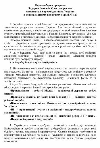 Другой кандидат, регулярно проигрывающий на этом же округе, Геннадий Задырко подал в ЦИК предвыборную программу, текст которой совпадает с программами нескольких других кандидатов на парламентских выборах в 2012 году.