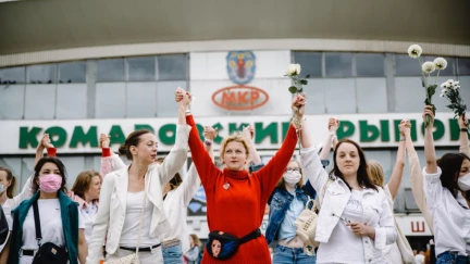 В Минске несколько сотен женщин в белых одеждах и с цветами в руках выстроились в цепь в знак солидарности против насилия во время протестов в Беларуси.
