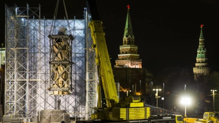 В ночь на 16 октября на Боровицкой площади в Москве началась установка памятнику князю Владимиру. 16-метровую фигуру без правой руки и креста доставили к Кремлю из мастерской в Химках.