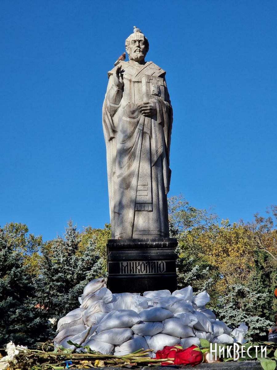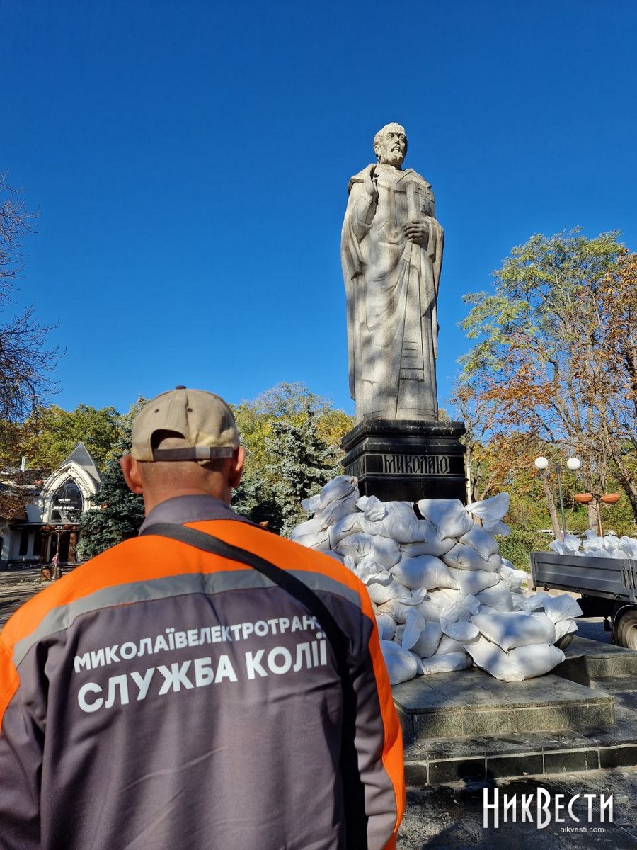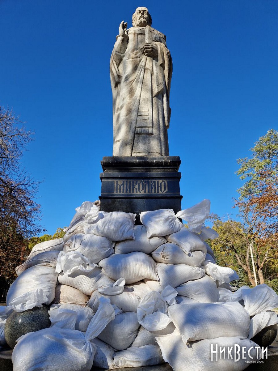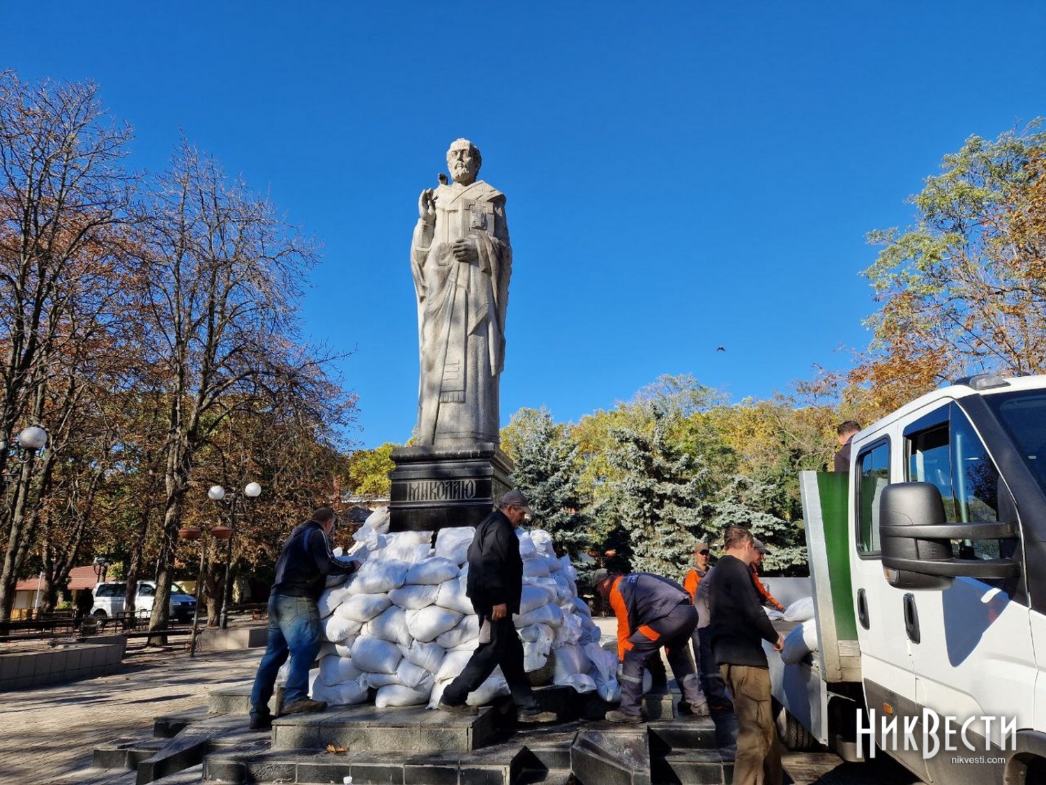 Днем 19 октября в Каштановом сквере начали обкладывать мешками с песком памятник покровителю города - Святому Николаю.