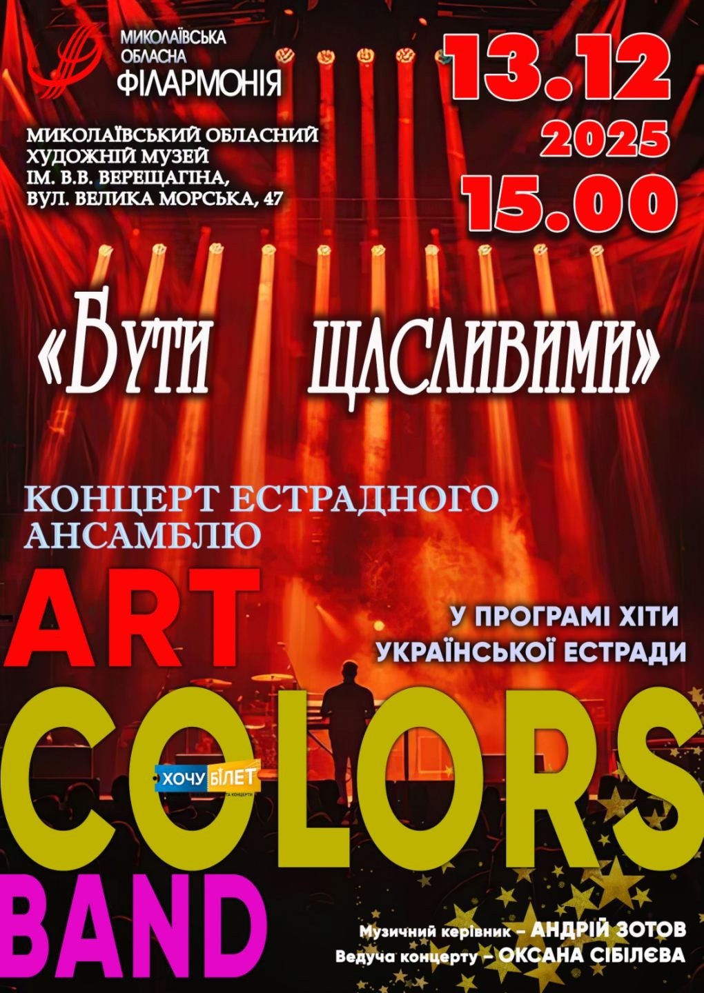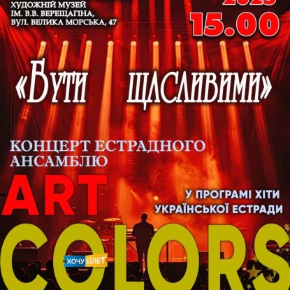 «Концерт эстрадного ансамбля "ART COLORS BAND" с программой «Быть счастливыми» — это музыкальное пространство, где каждая нота наполнена радостью, теплом и искренними эмоциями. Вас ждут любимые хиты украинской эстрады, яркое живое звучание и атмосфера, которая окутывает с первых аккордов», — говорится в анонсе.