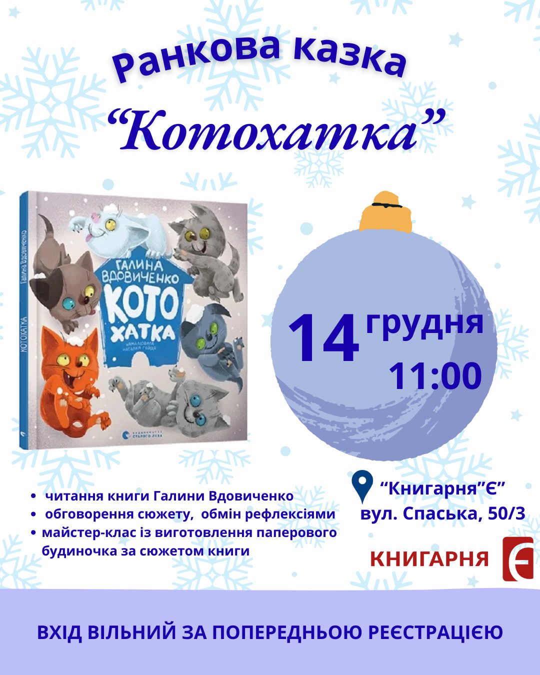 «Приглашаем детей и родителей на теплое и сказочное рождественское мероприятие в нашем магазине! Мы вместе окунемся в зимнюю атмосферу, читая историю «Котохатка» Галины Вдовиченко — добрую, светлую и полную праздничных чудес. После чтения малышей ждет творчество и настоящее рукоделие: Мастер-класс по изготовлению бумажного котодомика по сюжету книги. Это прекрасная возможность создать праздничное настроение, провести время вместе и забрать домой собственноручно сделанную сказку. Ждем вас в книжном магазине — приходите за теплыми эмоциями, вдохновением и магией, которая рождается в книгах. После мероприятия маленьких гостей ждет мини-фотосессия», — говорится в приглашении.