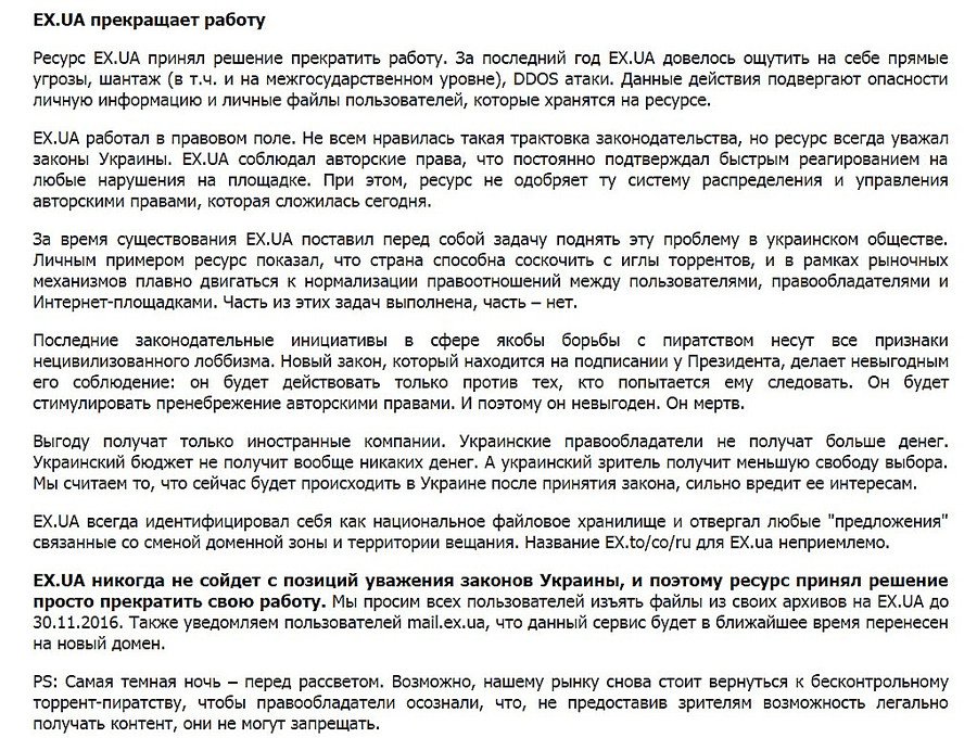 «EX.UA никогда не сойдет с позиций уважения законов Украины, и поэтому ресурс принял решение просто прекратить свою работу. Мы просим всех пользователей изъять файлы из своих архивов на EX.UA до 30 ноября 2016 года», - идет речь в сообщении.