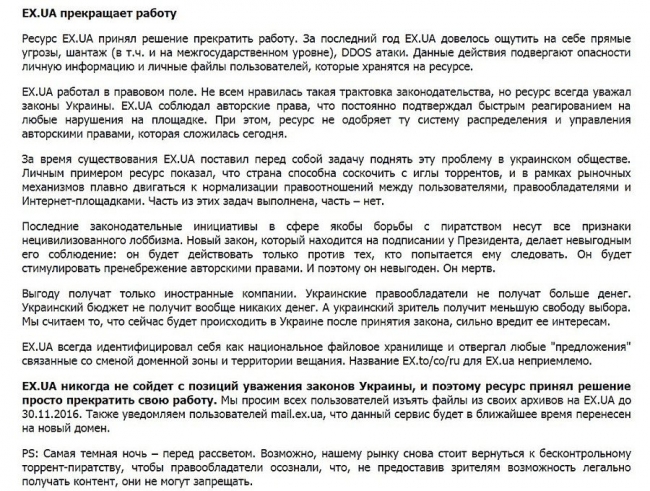 «Ресурс принял решение прекратить работу. За последний год EX.UA довелось ощутить на себе прямые угрозы, шантаж (в т.ч. и на межгосударственном уровне), DDOS-атаки. Данные действия подвергают опасности личную информацию и личные файлы пользователей, которые хранятся на ресурсе».