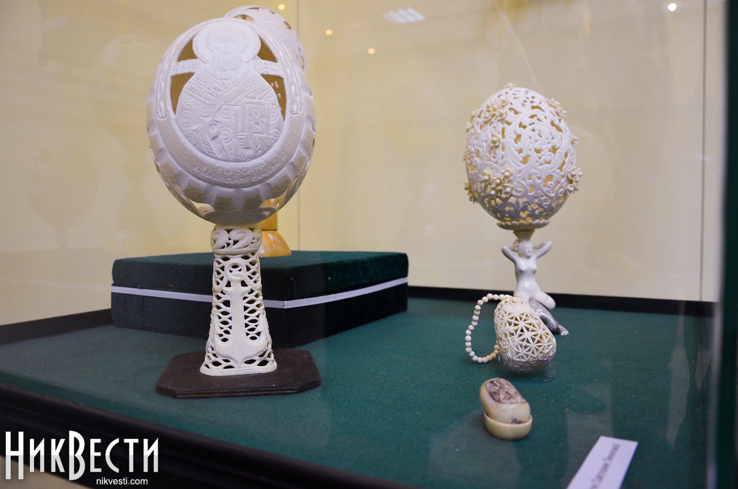Мастерица Светлана Леонова – участница более 60 отечественных и международных выставок. Работает с костью, рогом, бивнями и клыками животных, перламутром, деревом. Несколько лет назад увлеклась резьбой по шкарлупе и создала большое числа вырезанок из страусиных яиц. Является автором учебника «Возрождение забытого искусства». В настоящее время Светлана живет в Германии, на выставке присутствовала ее мать.