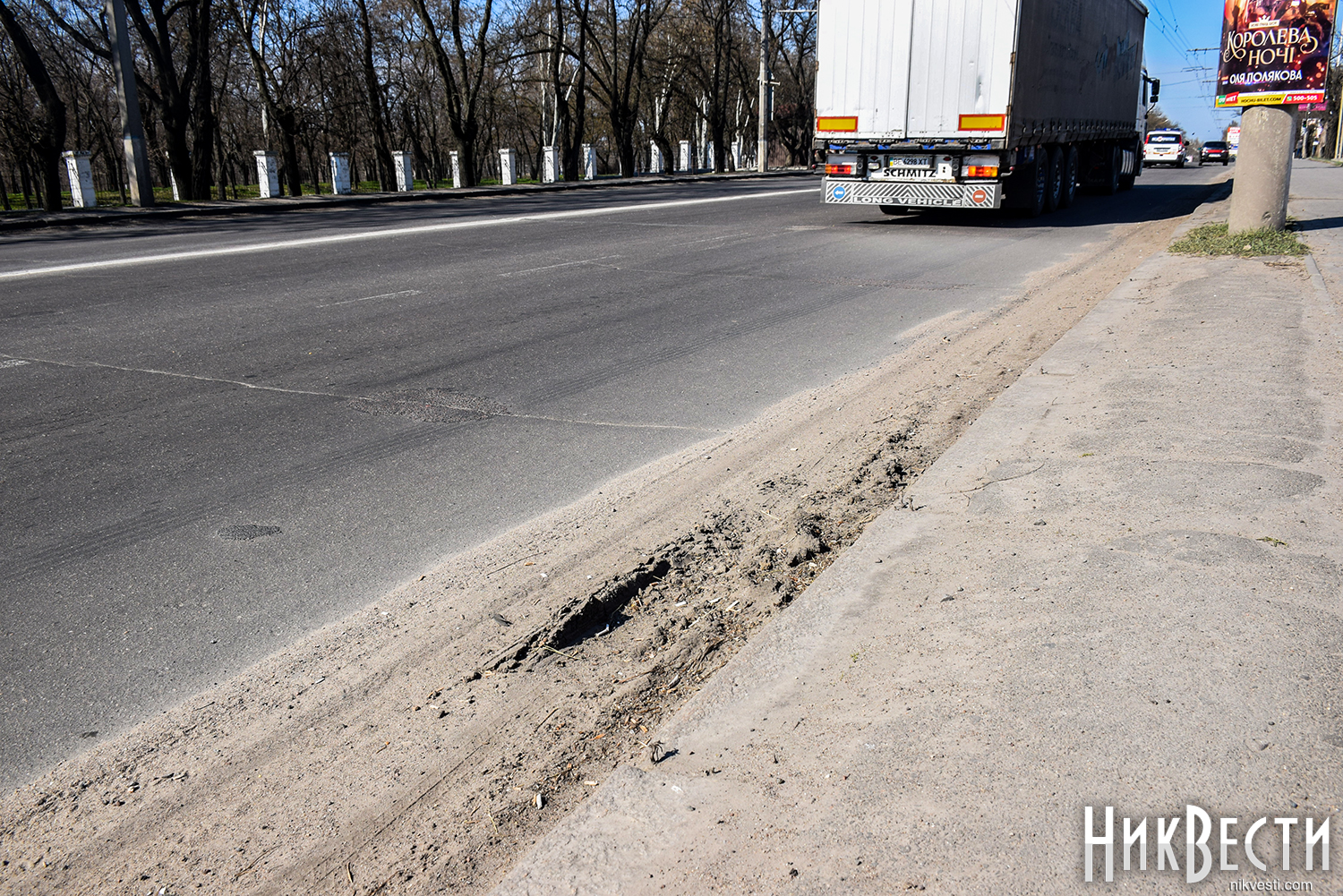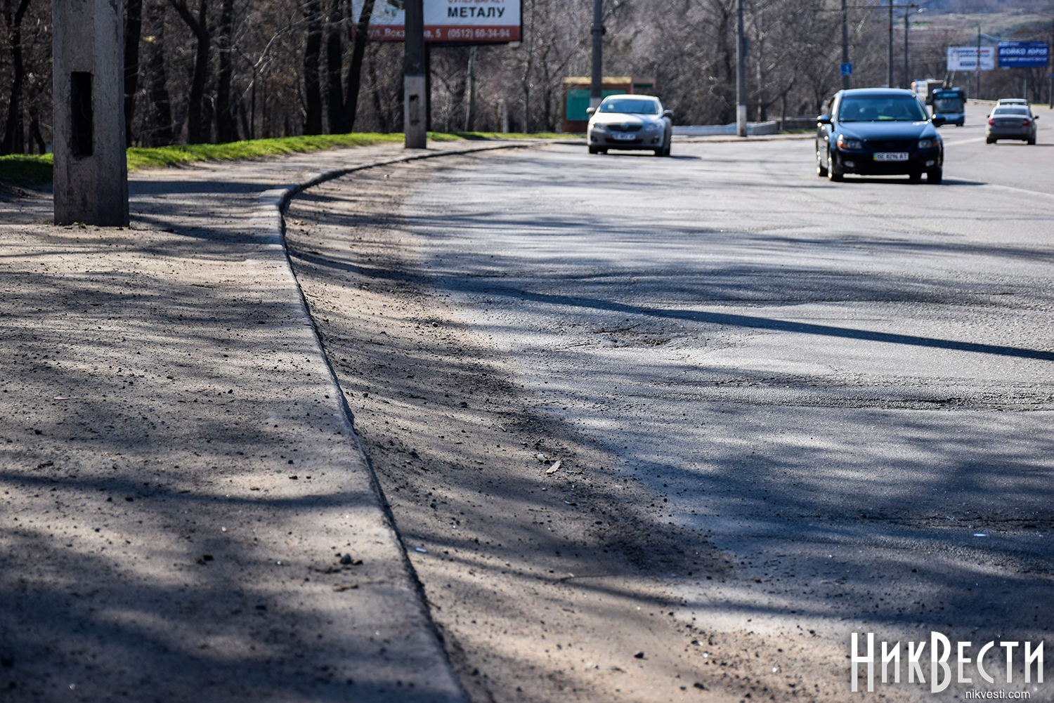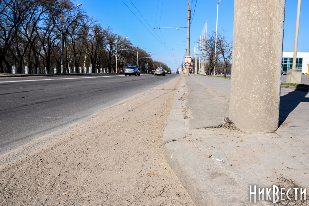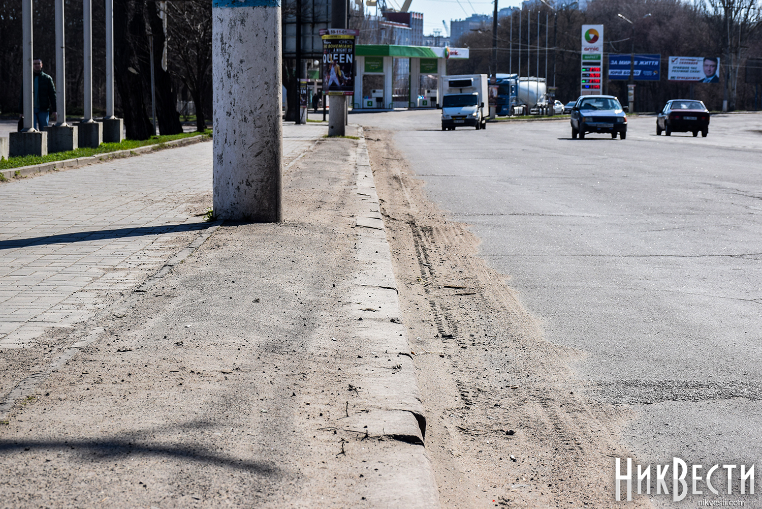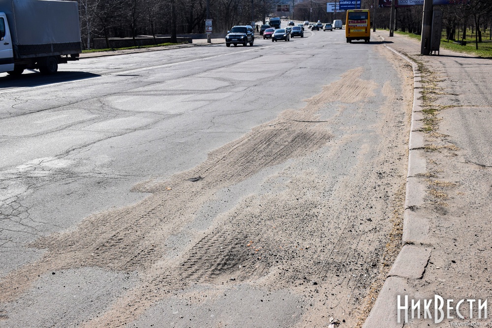 Прибордюрная часть дороги по проспекту Героев Украины и Ингульскому мосту, которые являются частью трассы М-14 «Николаев-Одесса», усыпаны песком, которым в зимний период посыпали асфальт.