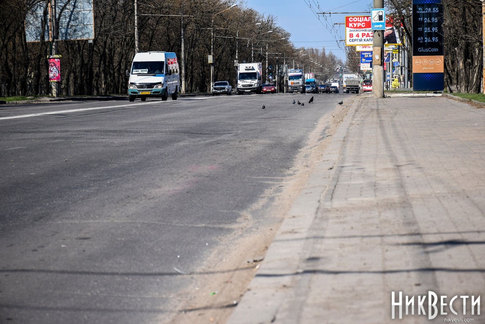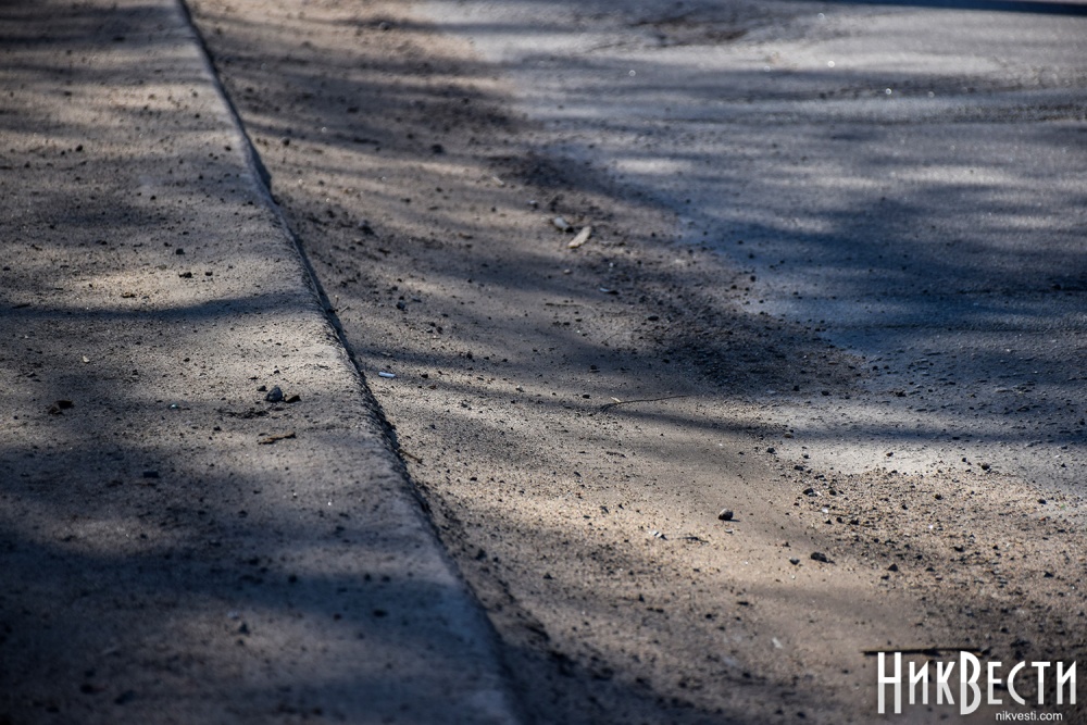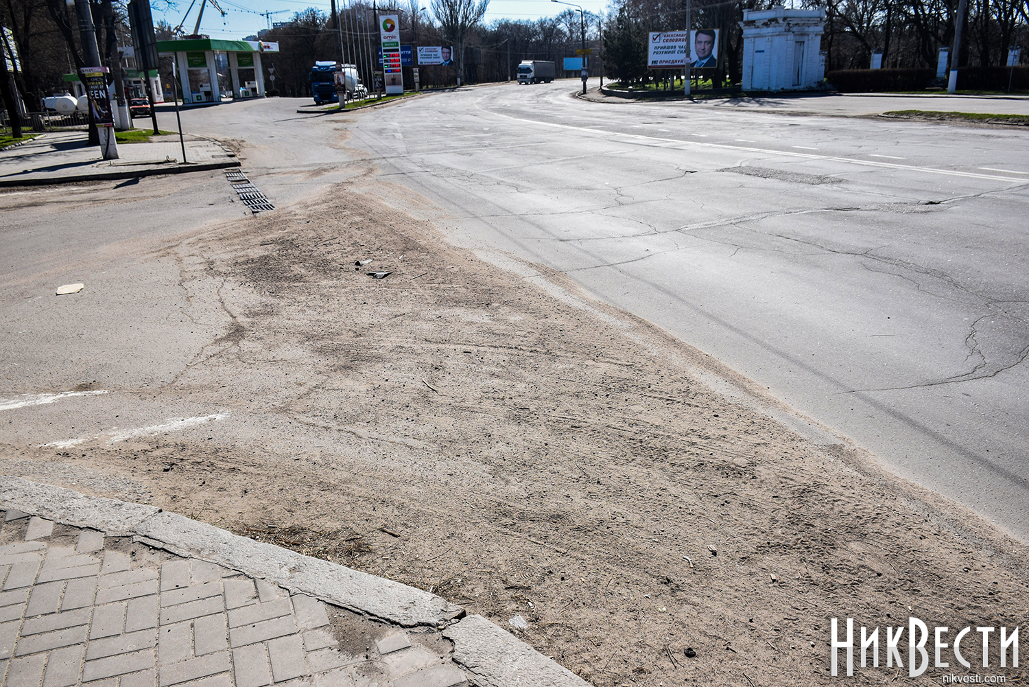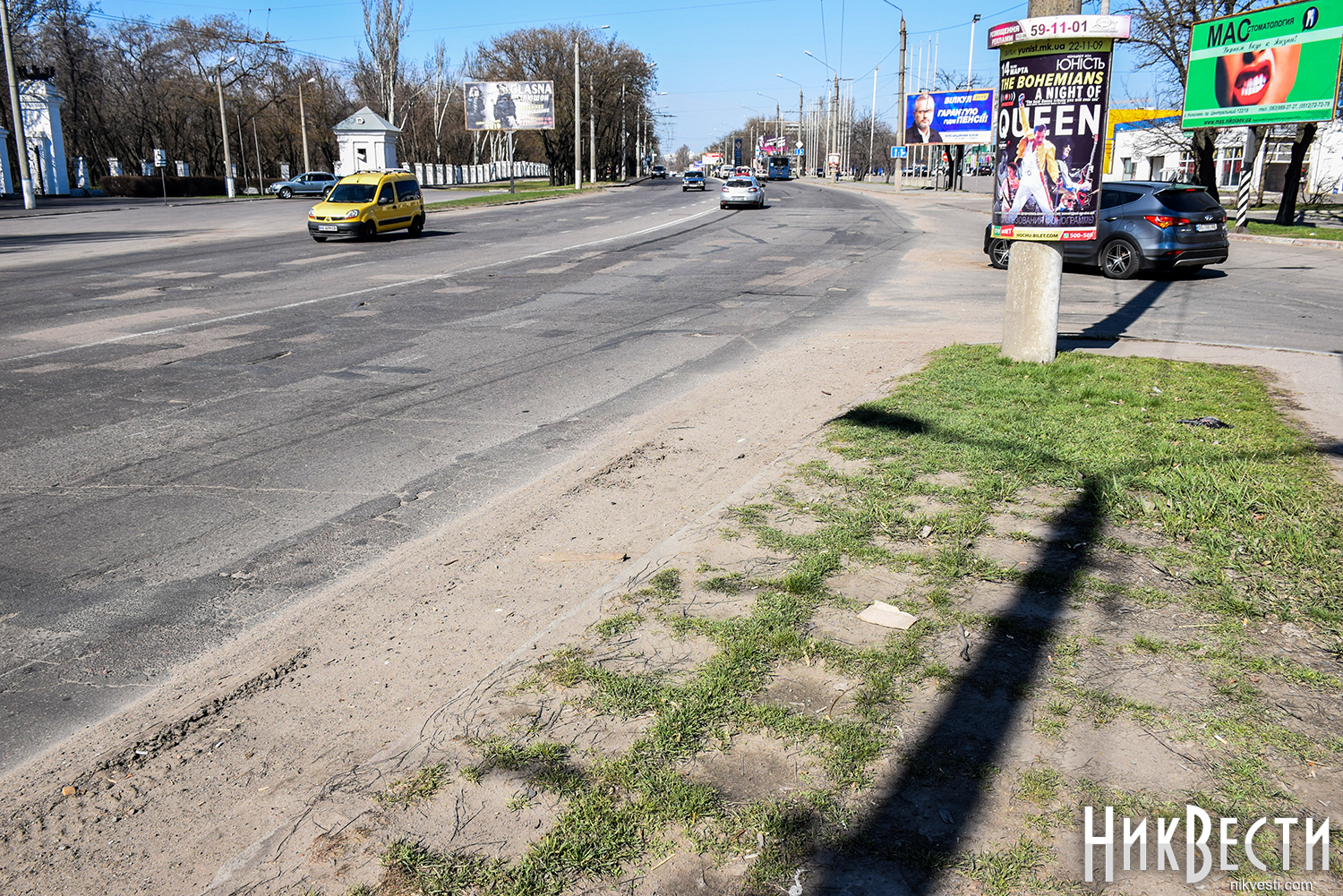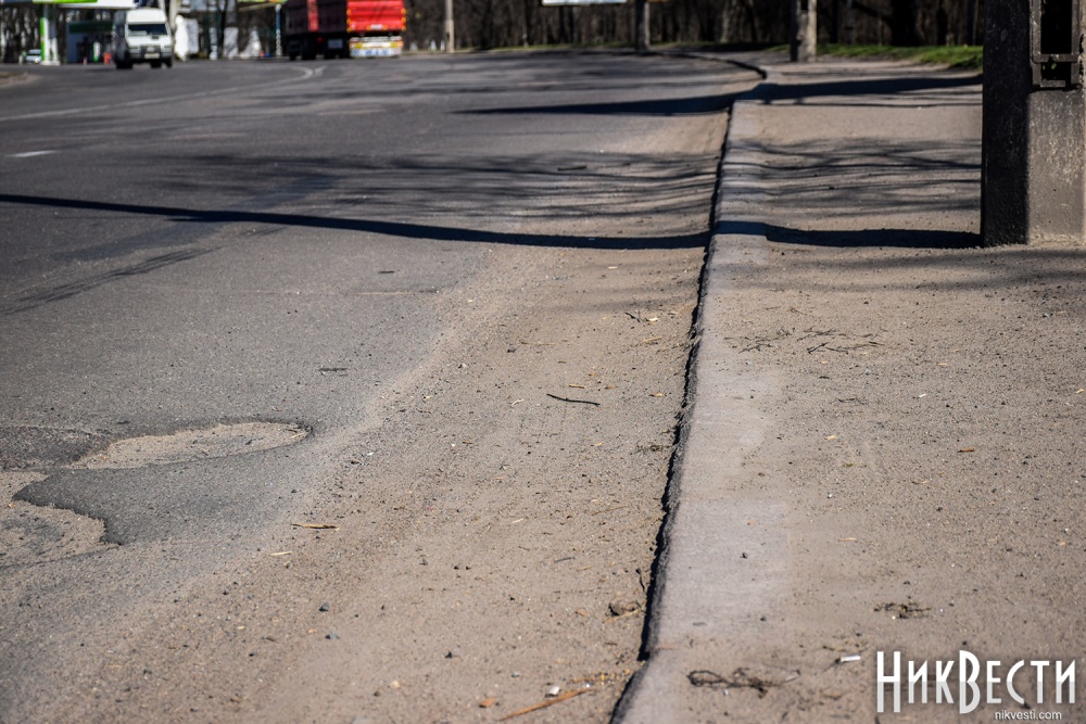 Прибордюрная часть дороги по проспекту Героев Украины и Ингульскому мосту, которые являются частью трассы М-14 «Николаев-Одесса», усыпаны песком, которым в зимний период посыпали асфальт.