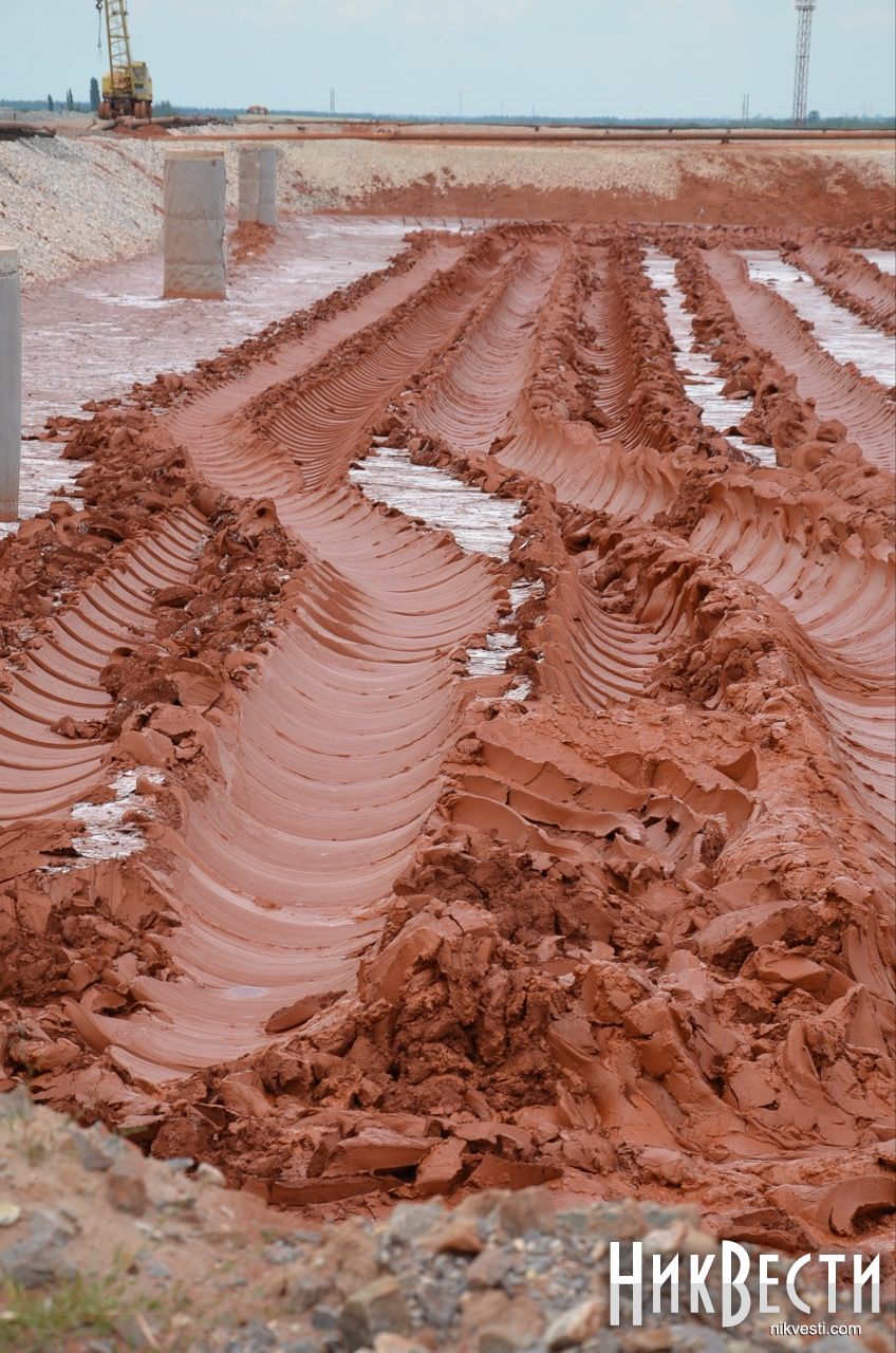 Красный шлам на «Николаевском глиноземном заводе» хранится на двух шламохранилищах. Первое было введено в эксплуатацию в 1980 году с проектной мощностью 20 миллионов м3 шлама. Шламохранилище №1 находится на первой пойменной террасе Днепро-Бугского лимана, в дамбах высотой 22 метра со стороны лимана и 12 метров со стороны склонов. Шлам складировался мокрым методом - для удобства транспортировки разбавляли водой.