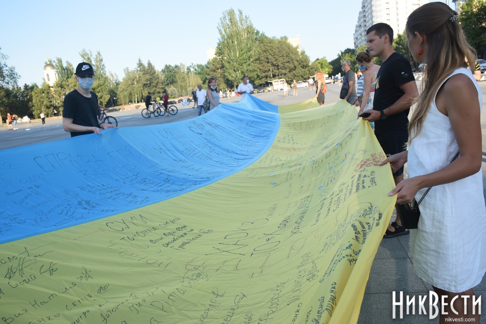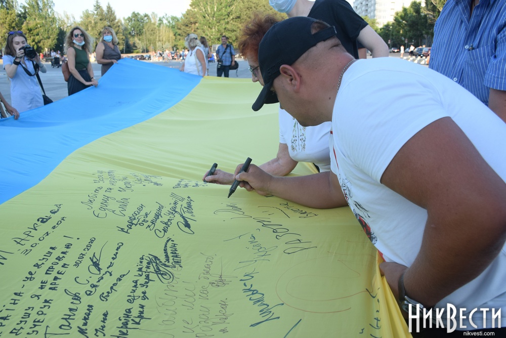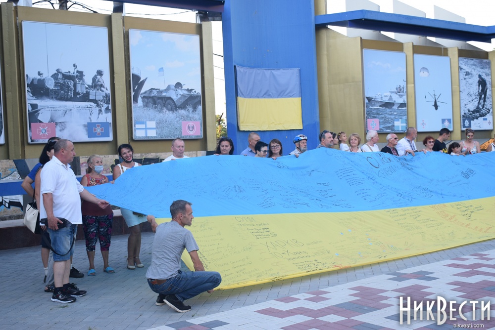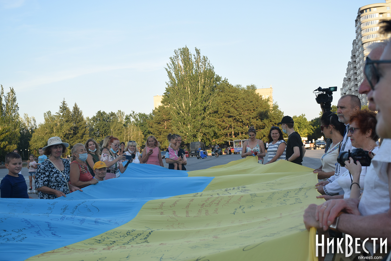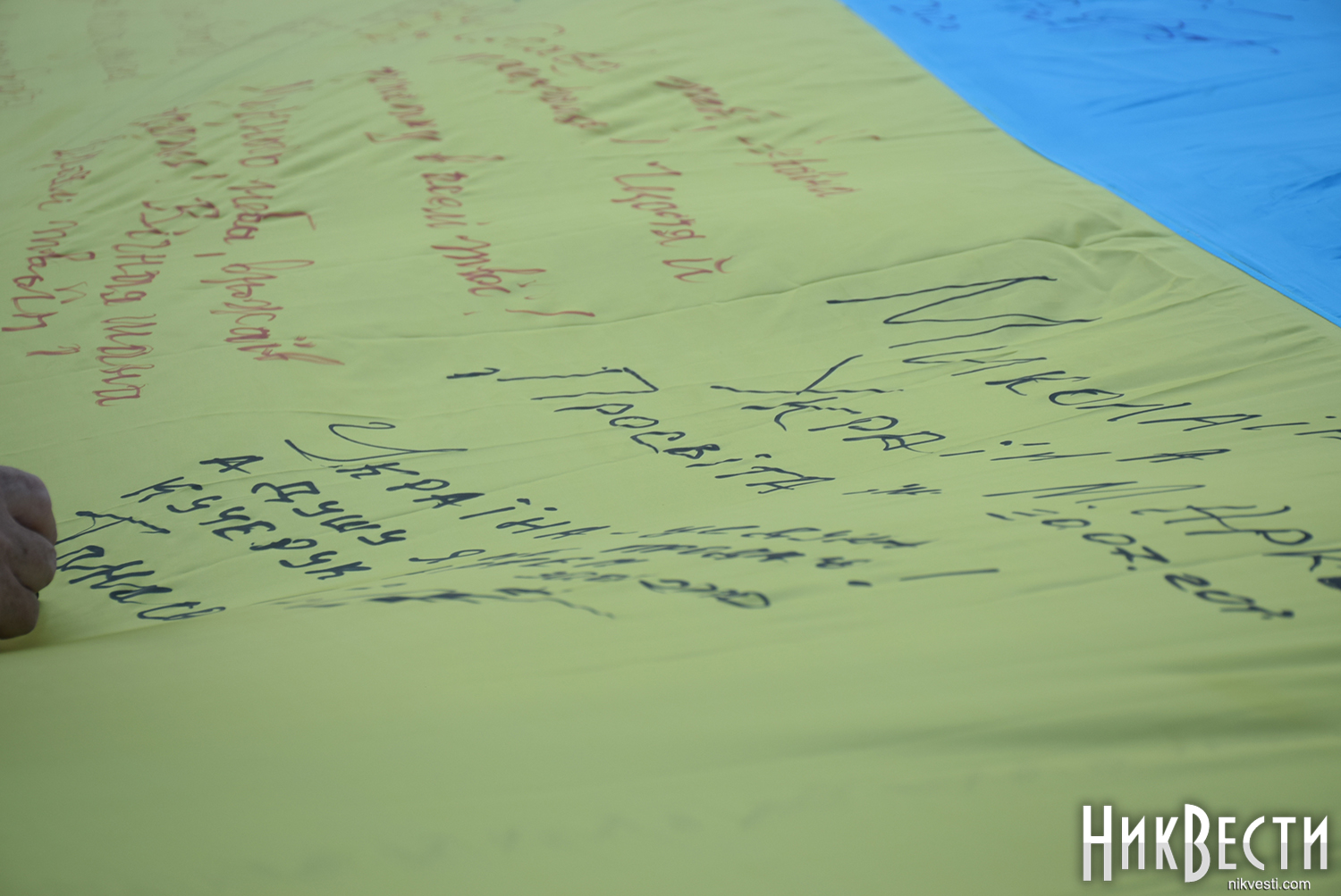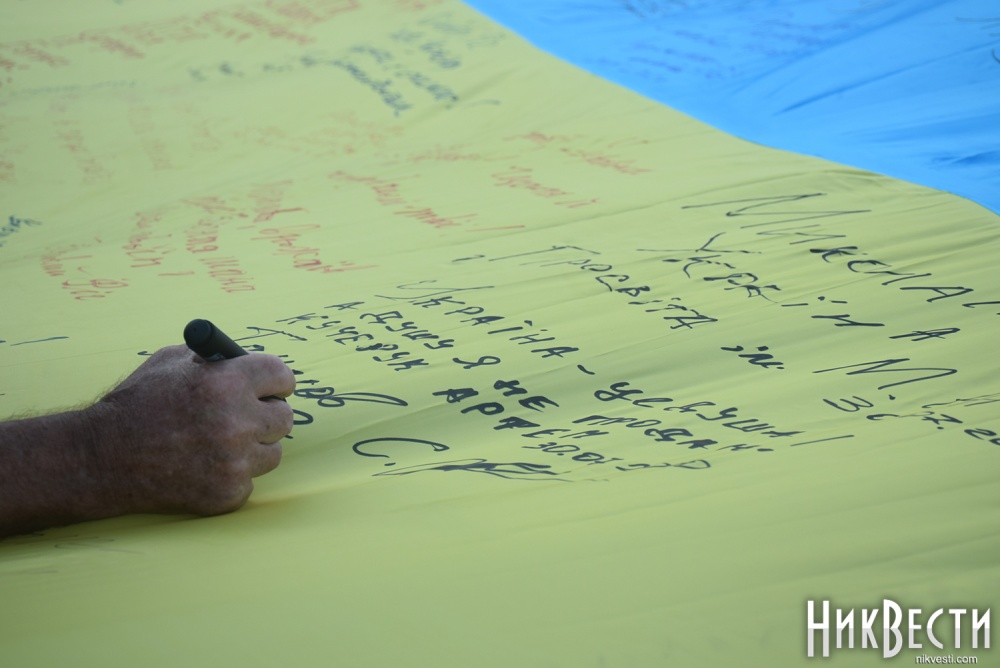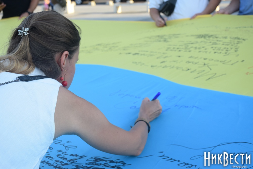 Сегодня, 30 июля, на Соборной площади в Николаеве в рамках всеукраинской акции прошла митинг «Флаг Единства», на котором николаевцы оставили на 20-метровом флаге Украины пожелания ко Дню Независимости.