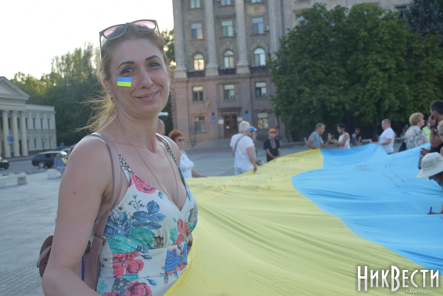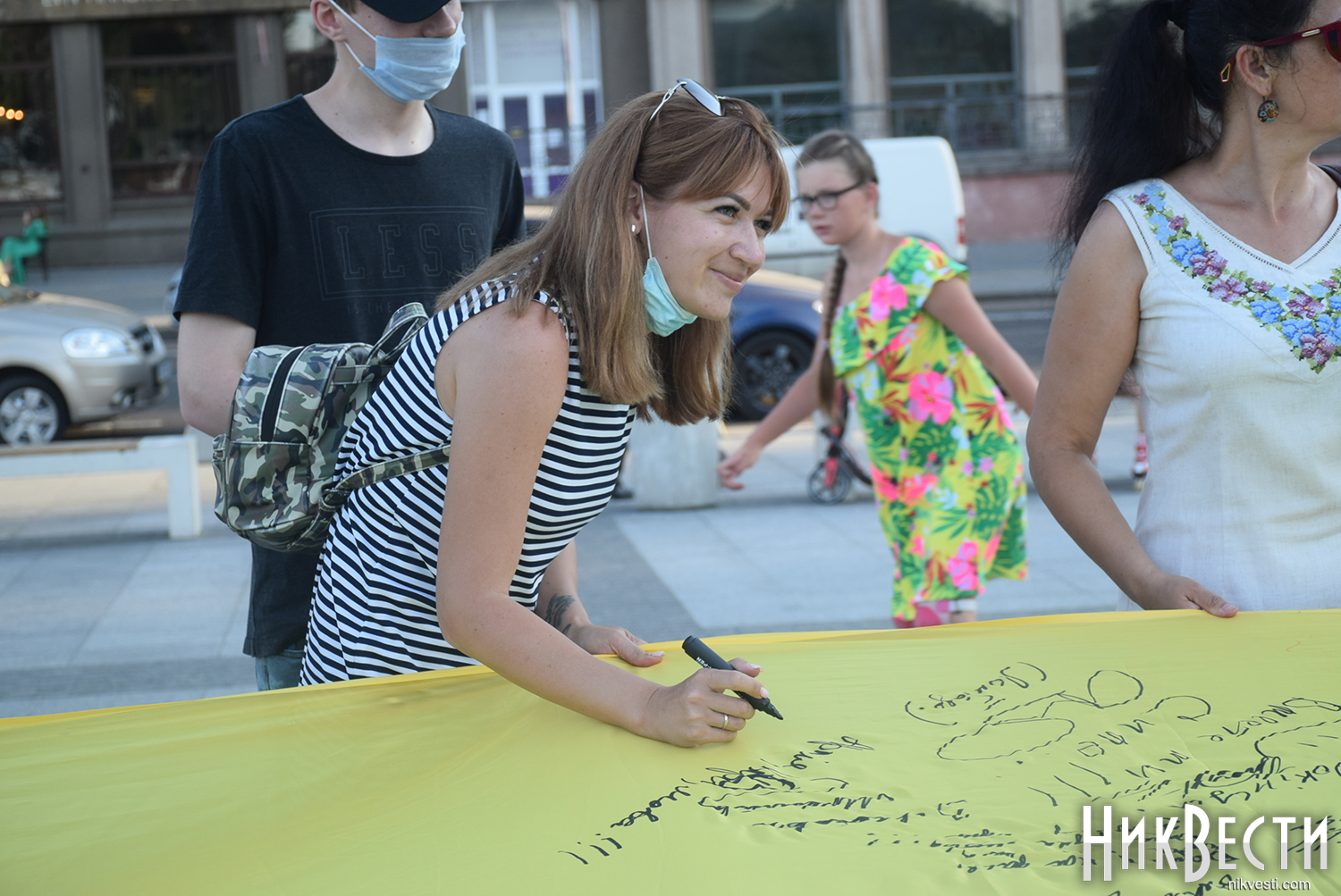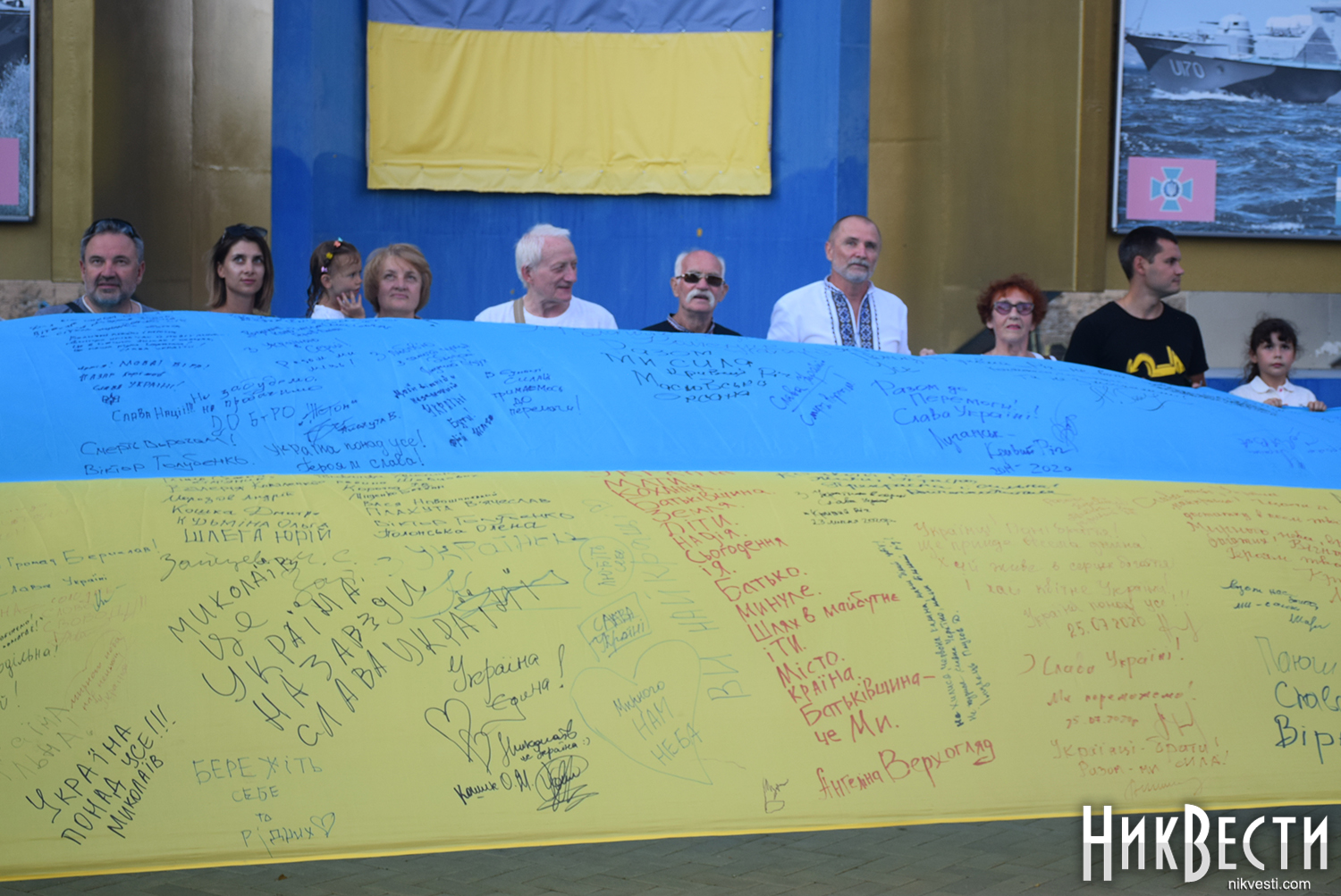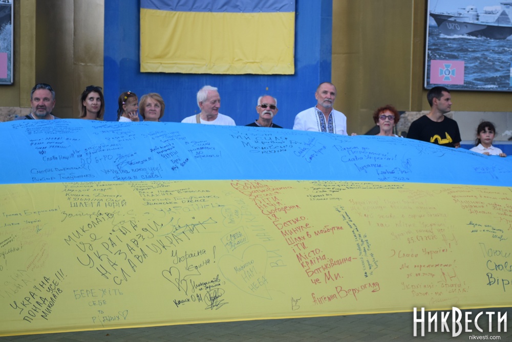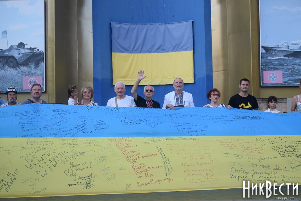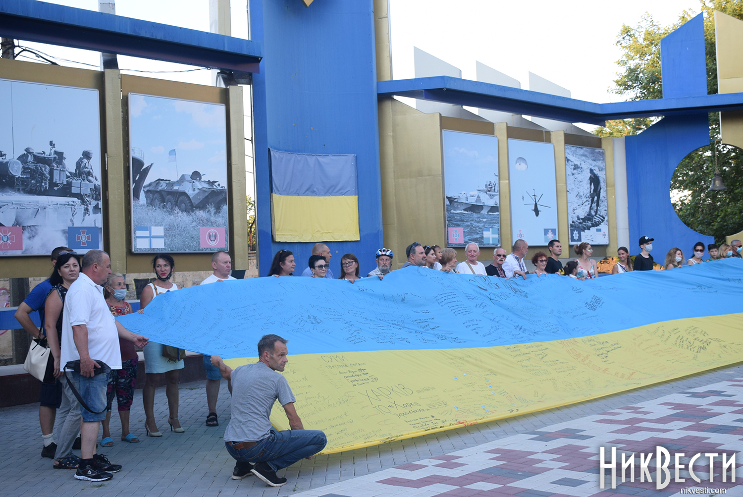 Сегодня, 30 июля, на Соборной площади в Николаеве в рамках всеукраинской акции прошла митинг «Флаг Единства», на котором николаевцы оставили на 20-метровом флаге Украины пожелания ко Дню Независимости.