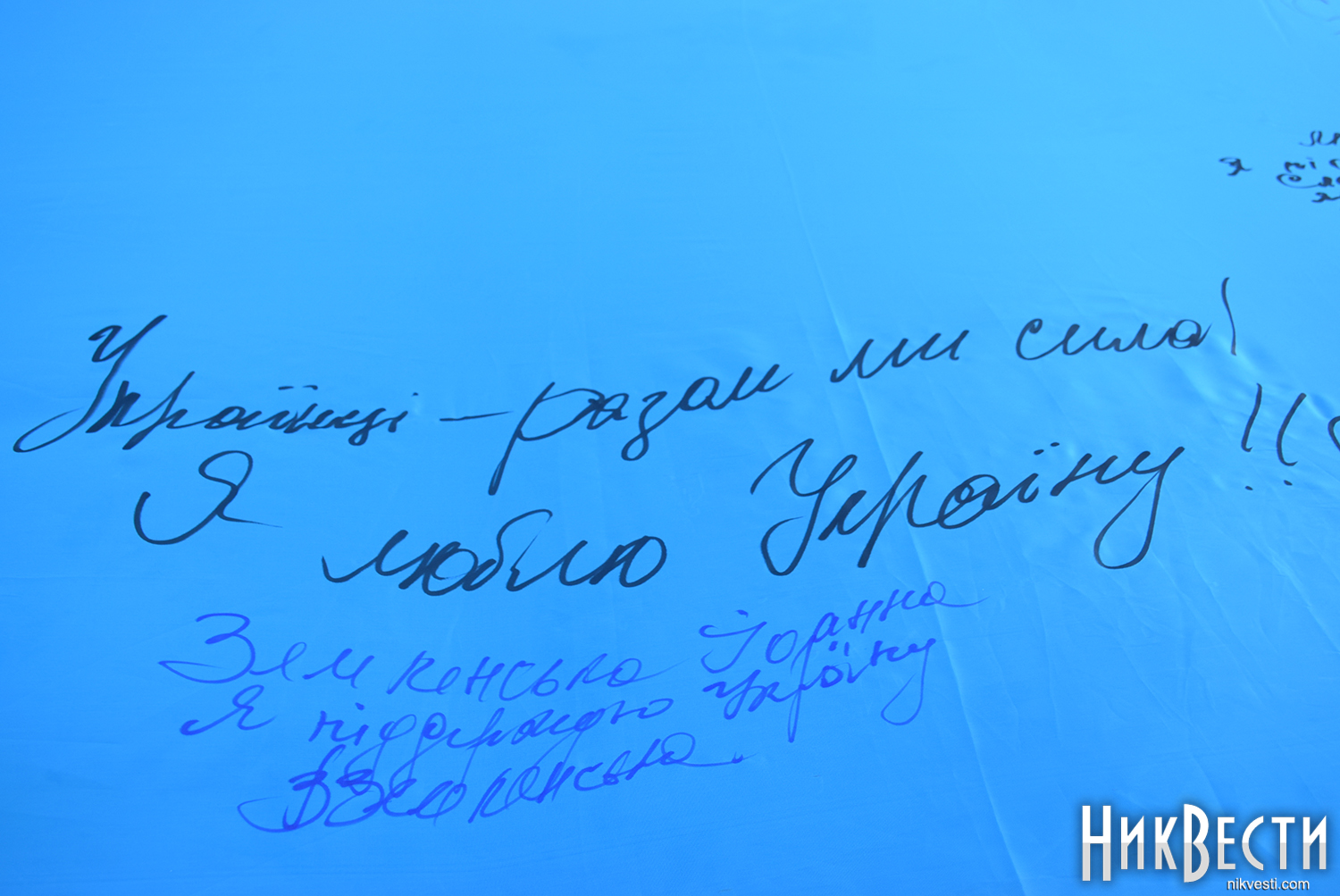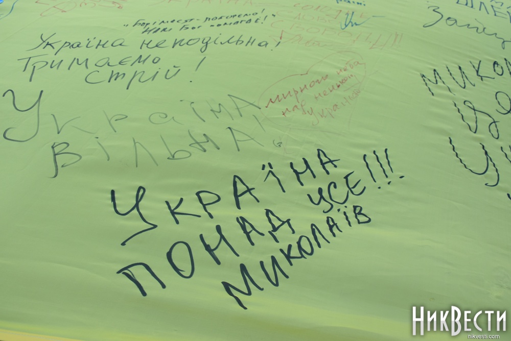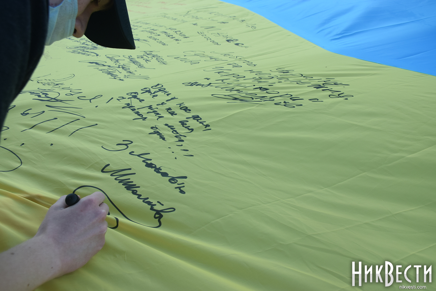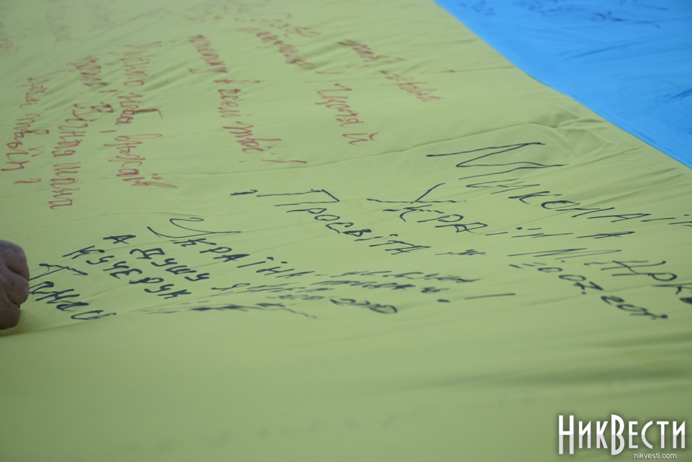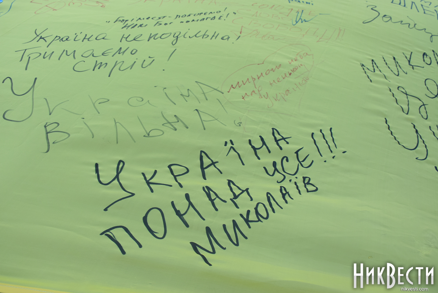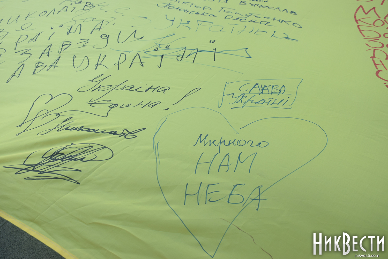 В данной акции приняли участие около 30 николаевцев. Горожане украсили флаг символическими надписями: «С Украиной в сердце», «Украина превыше всего», «Будущее — это мы! Вместе нас много», «Украина единая», «Украинцы — вместе мы сила! Я люблю Украину», «Слава украинским воинам! Мы с вами».