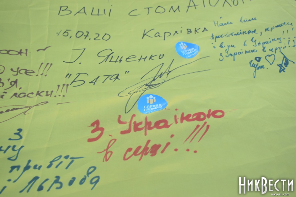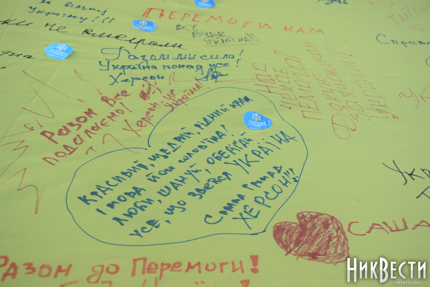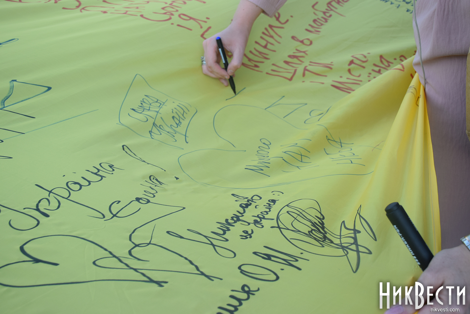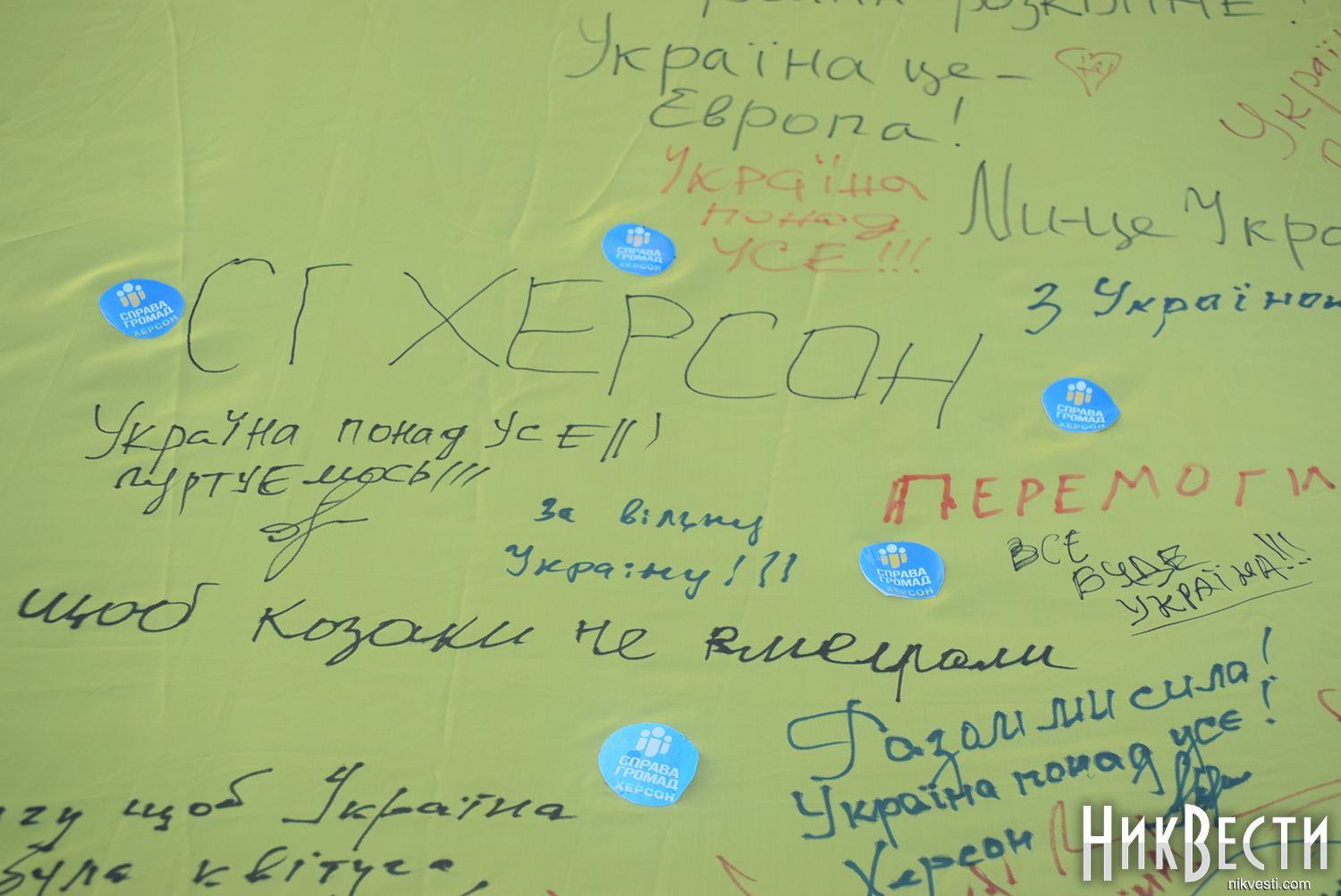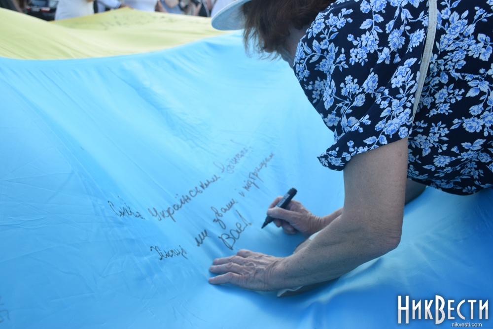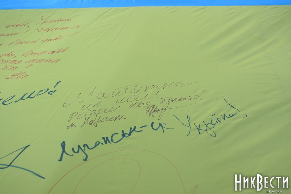 В данной акции приняли участие около 30 николаевцев. Горожане украсили флаг символическими надписями: «С Украиной в сердце», «Украина превыше всего», «Будущее — это мы! Вместе нас много», «Украина единая», «Украинцы — вместе мы сила! Я люблю Украину», «Слава украинским воинам! Мы с вами».