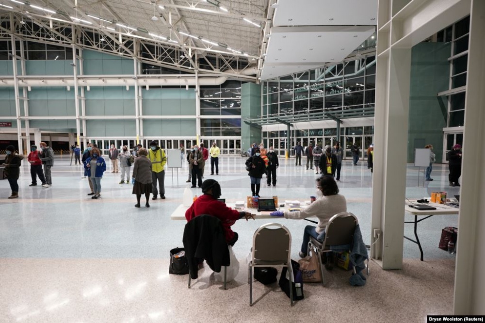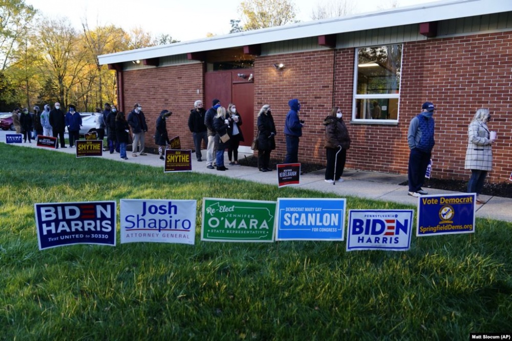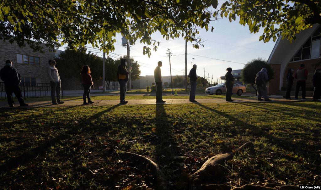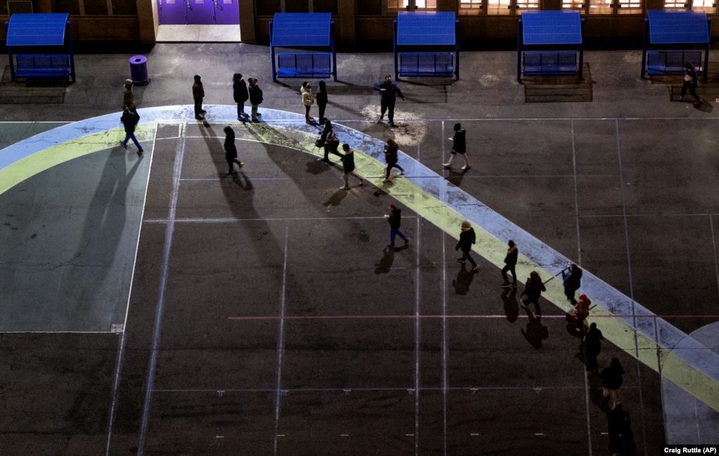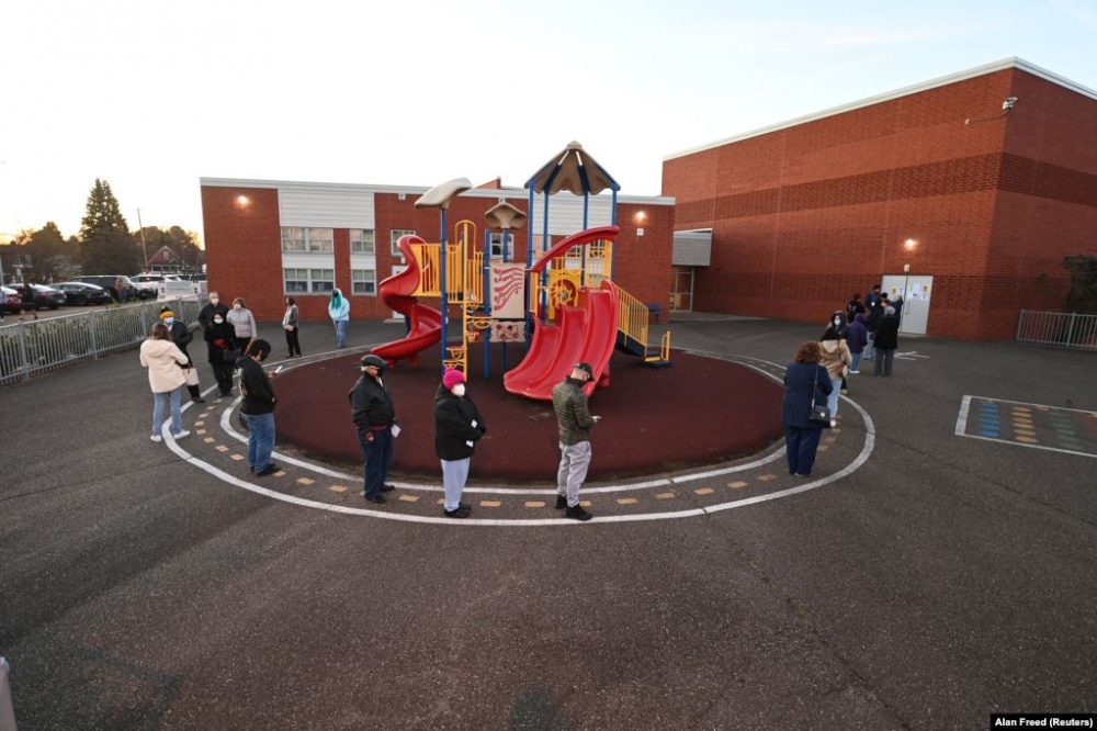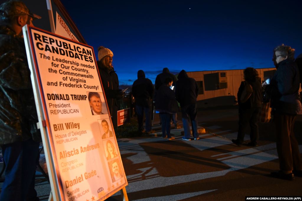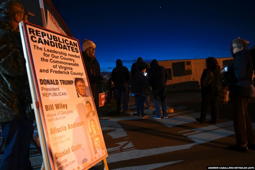 На рассвете избиратели ждут в очереди на избирательном участке в Винчестере, штат Вирджиния, 3 ноября 2020