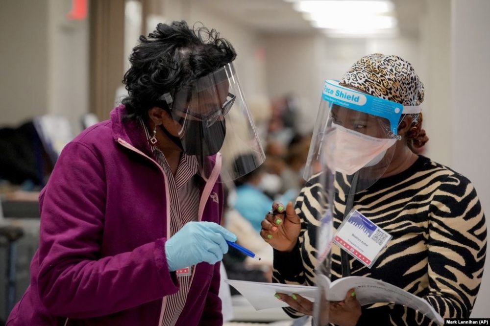 Избирательные инспекторы Беатрис Ентви (справа) и Ди Джонс просматривают инструкцию на избирательном участке в районе Бронкс, Нью-Йорк