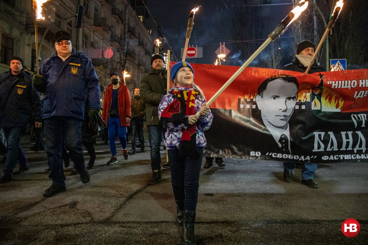 Участники шествия зажгли факелы, держали в руках украинские флаги, революционные флаги ОУН и баннеры с надписями «Бандера придет — порядок наведет», «Наша религия — национализм! Наш пророк — Степан Бандера!».