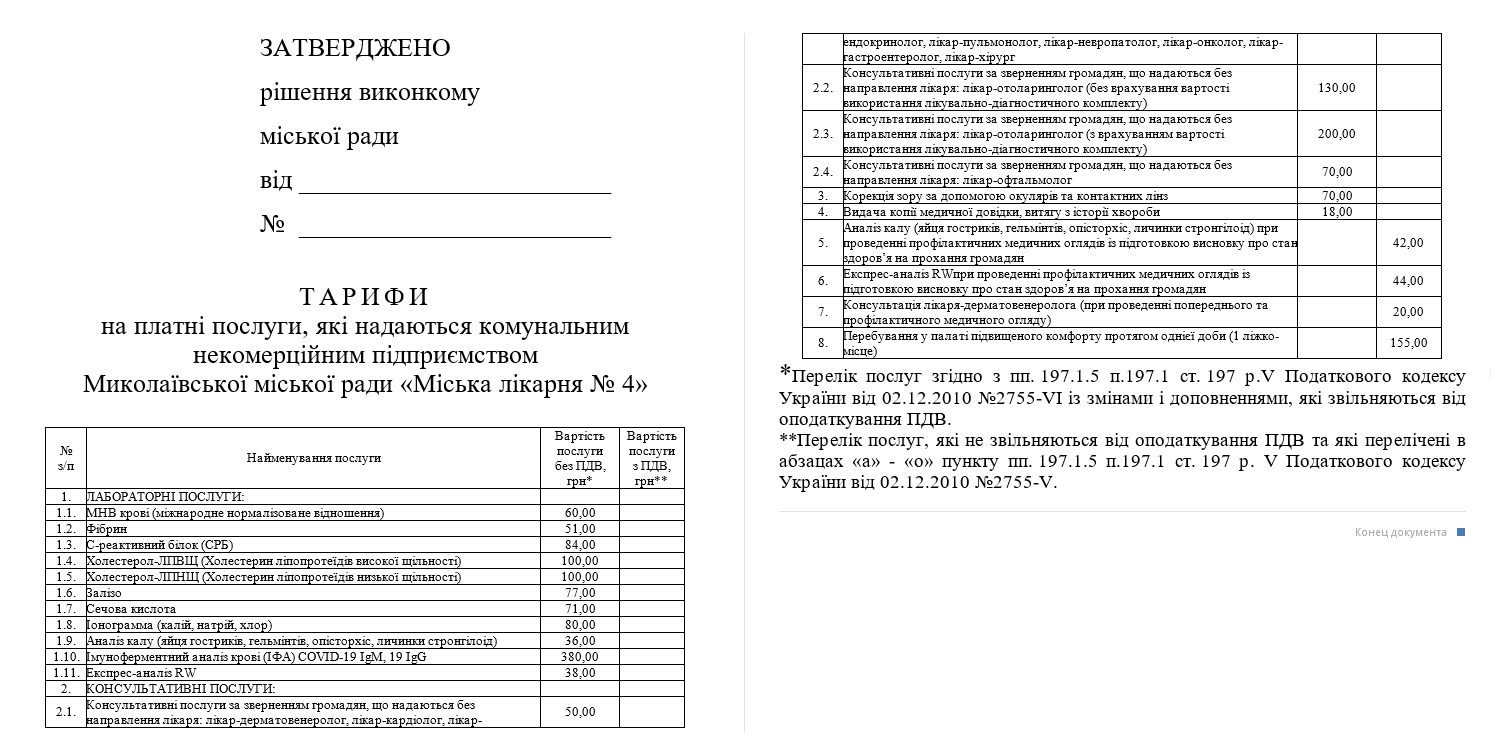 В пятницу, 15 января, исполком Николаевского городского совета своим решением установил тарифы на платные медицинские услуги, предоставляемые коммунальным некоммерческим предприятием Николаевского городского совета «Городская больница №4».