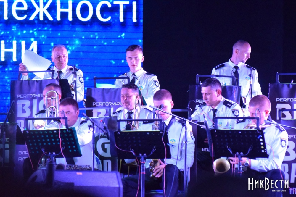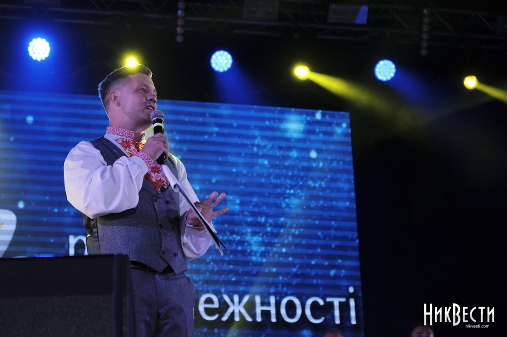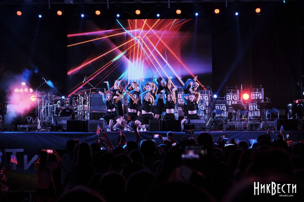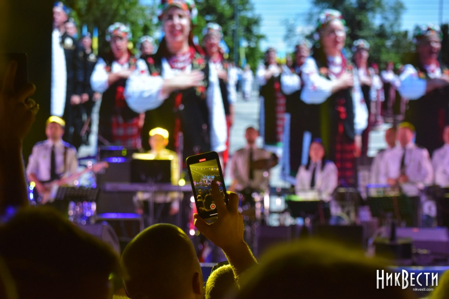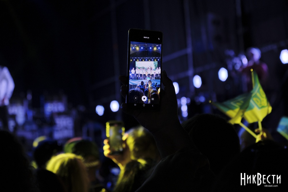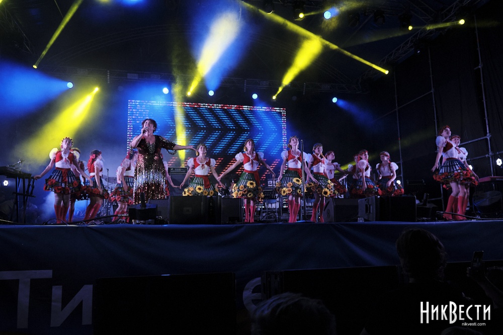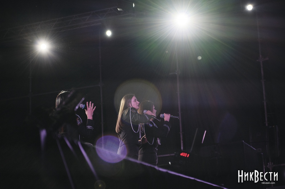 Открыли концерт трансляцией ролика флешмоба с исполнением гимна Украины на Соборной площади и небольшим фейерверком. После на сцене выступали николаевские коллективы, которые исполняли известные украинские и зарубежные песни.