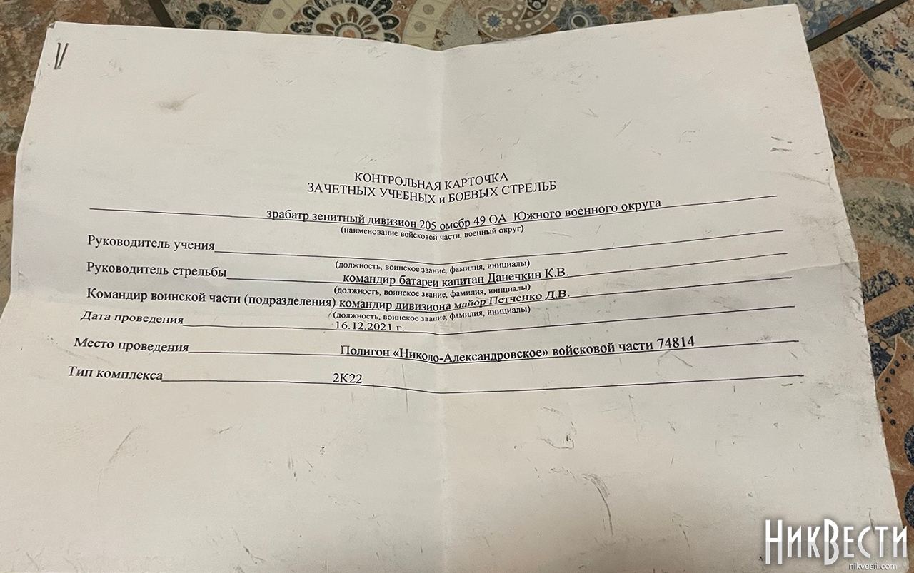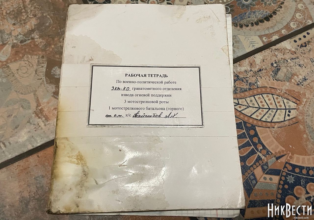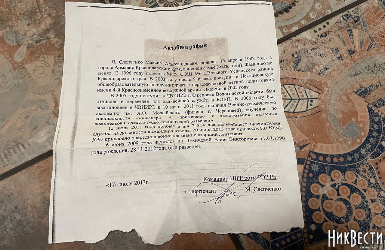 Помимо рабочей тетради, были найдены и другие документы российских солдат. В частности, там была автобиография командира 1ВВР роты РЭБ РБ, в/ч 74814, старшего лейтенанта Максима Слепченко 1988 года рождения из Краснодарского края, город Армавир. Там же были данные кредитной карточки ВТБ Банка на имя Максима Слепченко, выписки из приказов о проведенных в декабре учениях на войсковом стрельбище полигона «Николо-Александровский» войсковой части 74814, контрольная карточка зачетных учебных и боевых стрельб зенитной ракетной артиллерийской батареи зенитного дивизиона 205-й отдельной мотострелковой казачьей бригады 49 ОА Южного военного округа.