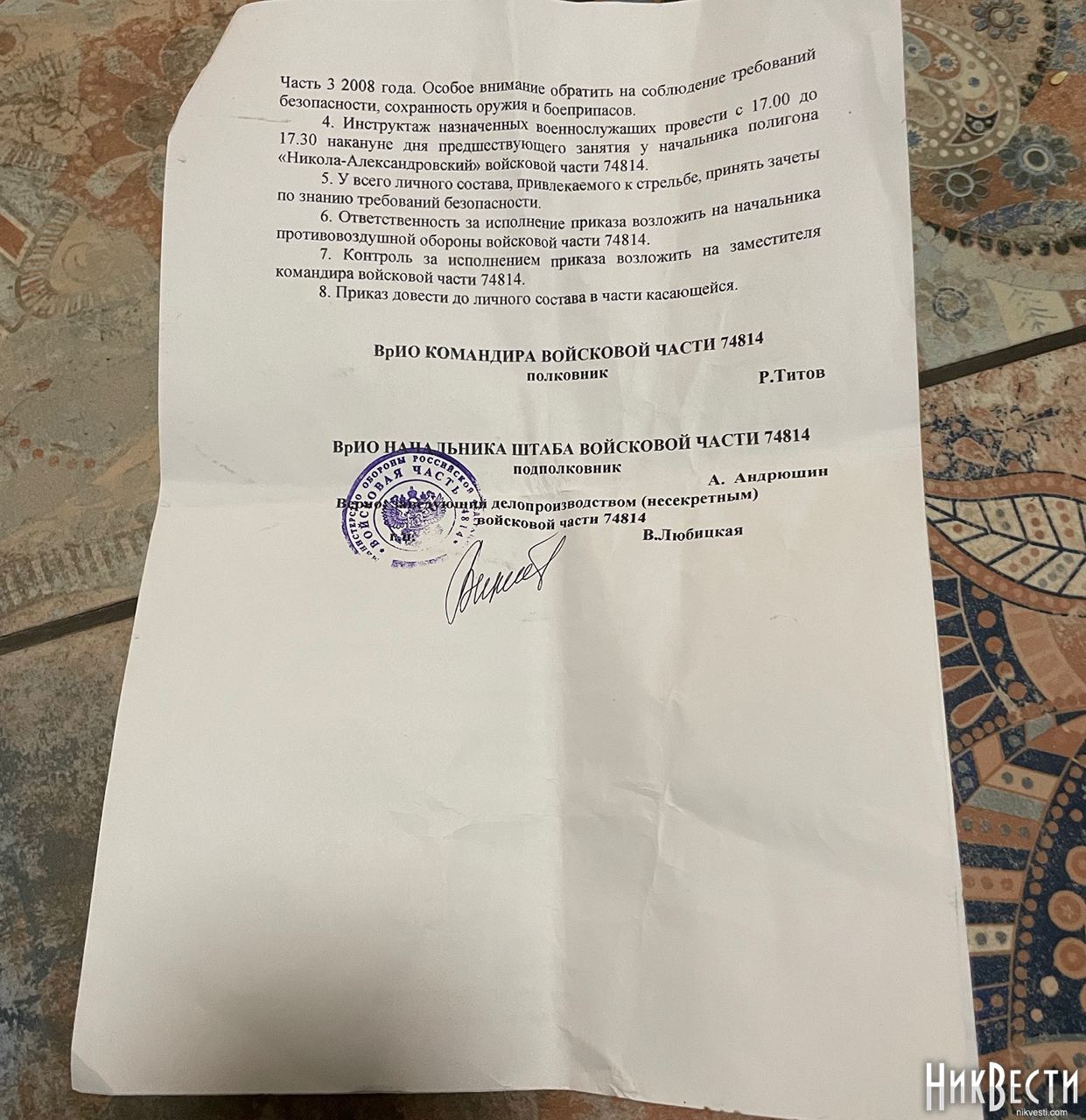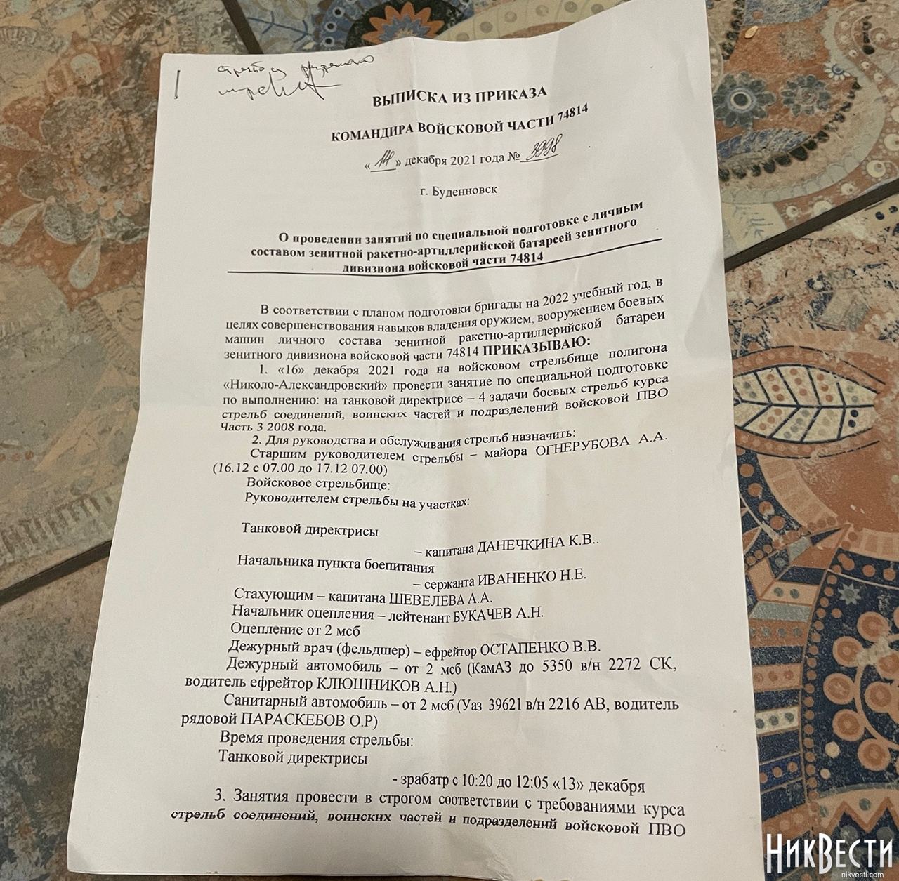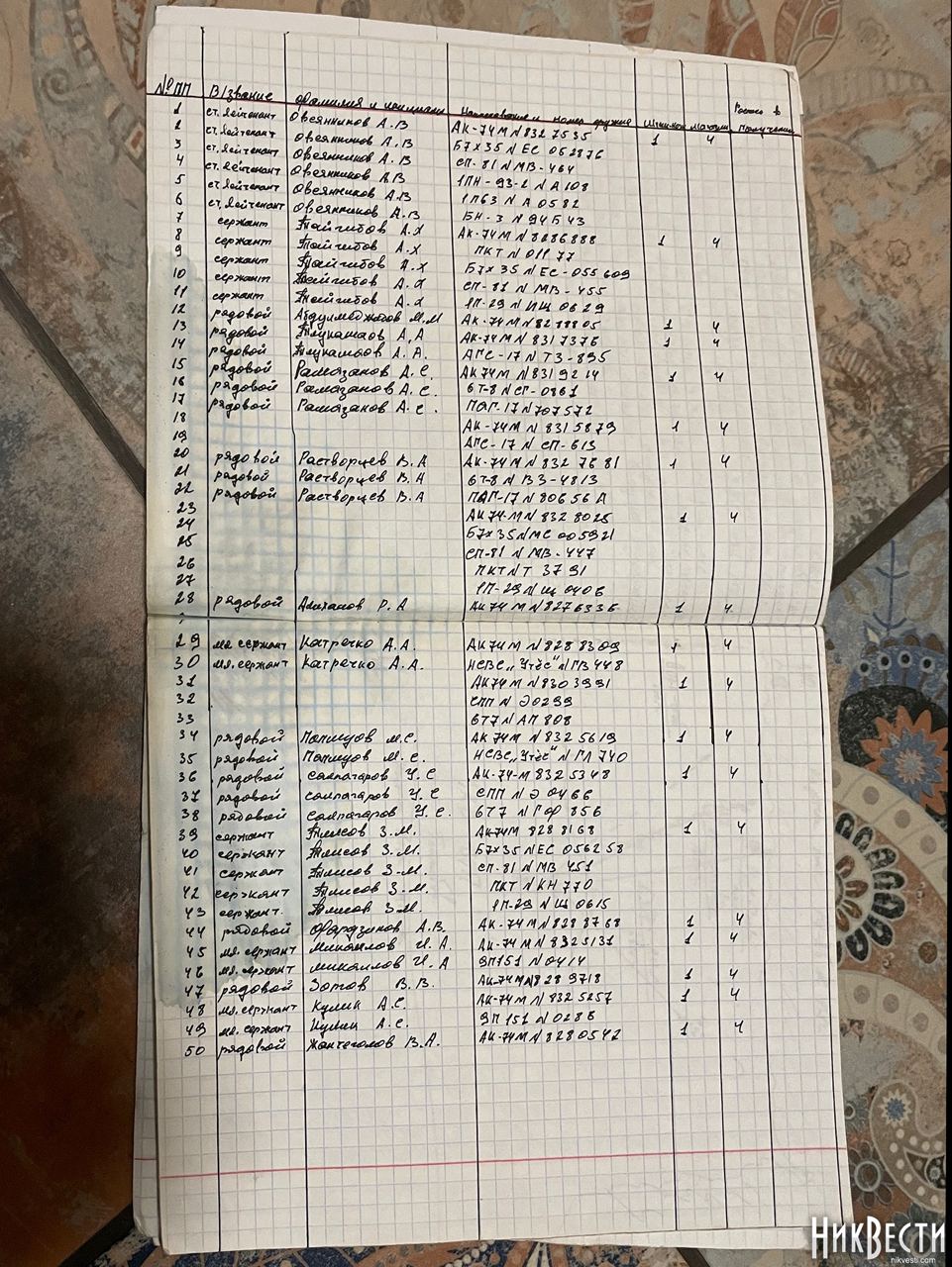 Помимо рабочей тетради, были найдены и другие документы российских солдат. В частности, там была автобиография командира 1ВВР роты РЭБ РБ, в/ч 74814, старшего лейтенанта Максима Слепченко 1988 года рождения из Краснодарского края, город Армавир. Там же были данные кредитной карточки ВТБ Банка на имя Максима Слепченко, выписки из приказов о проведенных в декабре учениях на войсковом стрельбище полигона «Николо-Александровский» войсковой части 74814, контрольная карточка зачетных учебных и боевых стрельб зенитной ракетной артиллерийской батареи зенитного дивизиона 205-й отдельной мотострелковой казачьей бригады 49 ОА Южного военного округа.