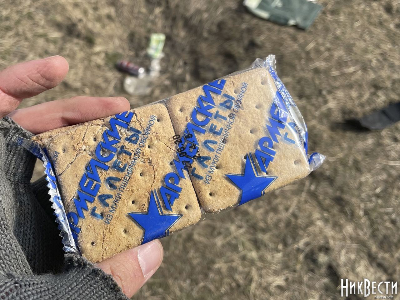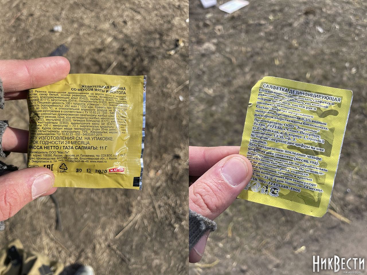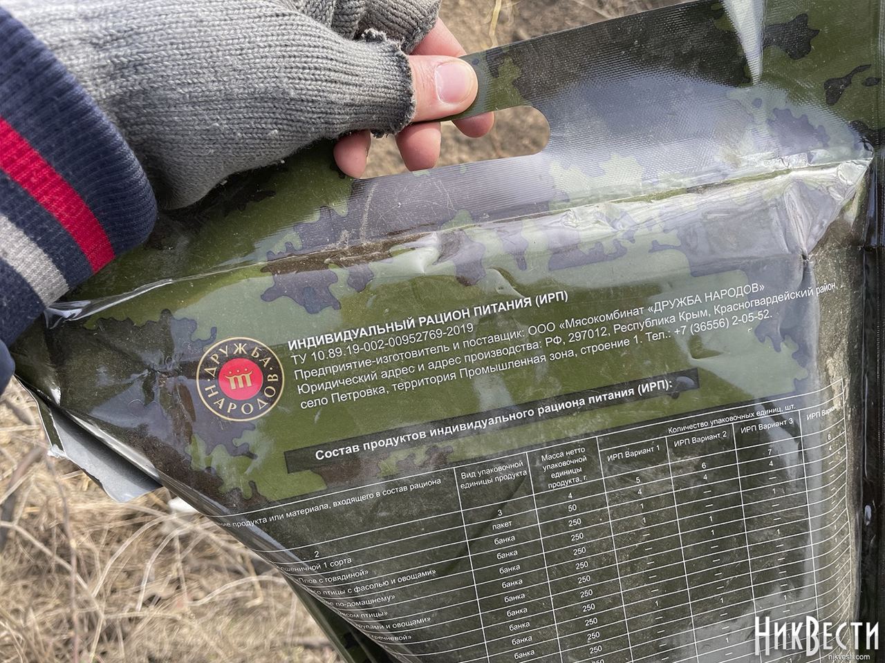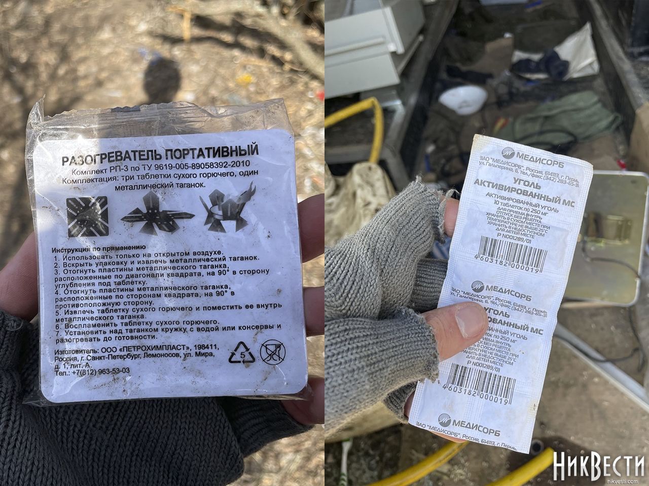 Также были найдены продукты и индивидуальныйрацион питания, активированный уголь, спички, печение, портативный разогреватель и даже вещи российских солдат.