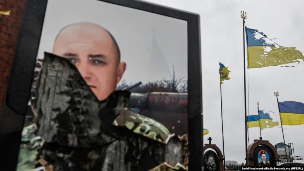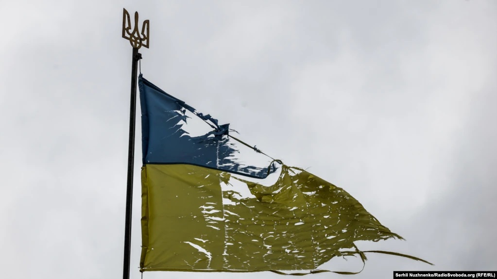 Поврежденные обстрелами флаги и обелиски украинских воинов, погибших при операции Объединенных сил на востоке страны. Чернигов, 6 апреля 2022 года