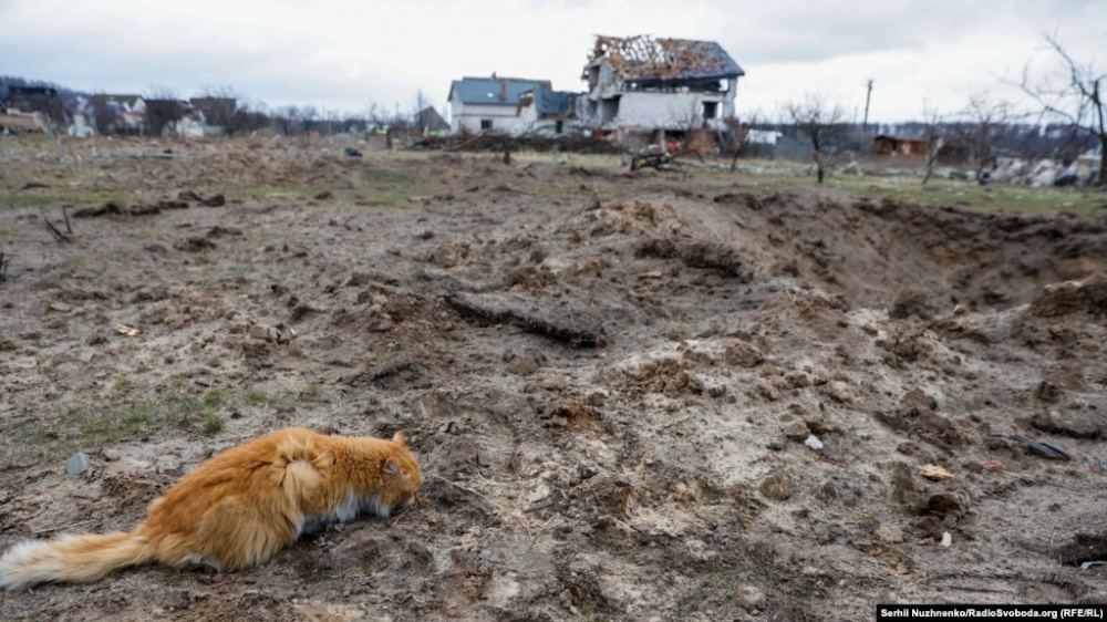 Кот ест возле воронки от российской авиабомбы в селе Новоселки, недалеко от Чернигова, 6 апреля 2022 года