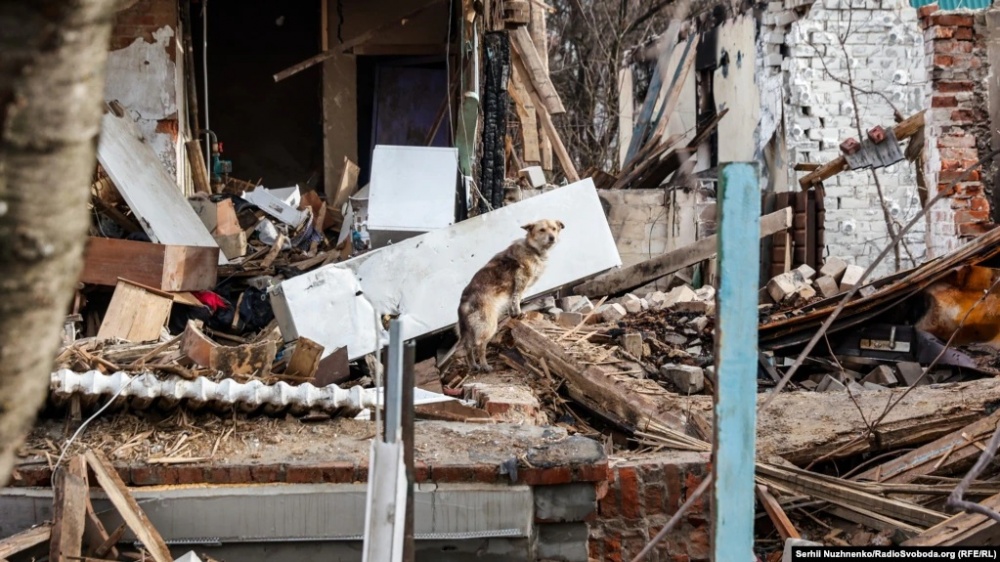 Пес стоит на развалинах жилого дома, разрушенного российскими авиаударами по частному сектору в Чернигове, 6 апреля 2022 года